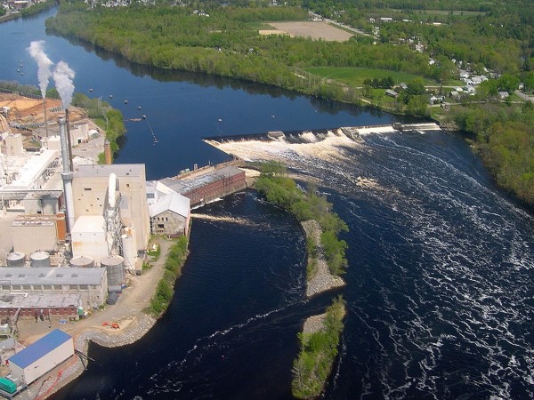 - The soon-to-be-removed Great Works Dam on the Penobscot River in Old Town is adjacent to the Old Town Fuel and Fiber facility, seen on left. Photographed late May 2012.