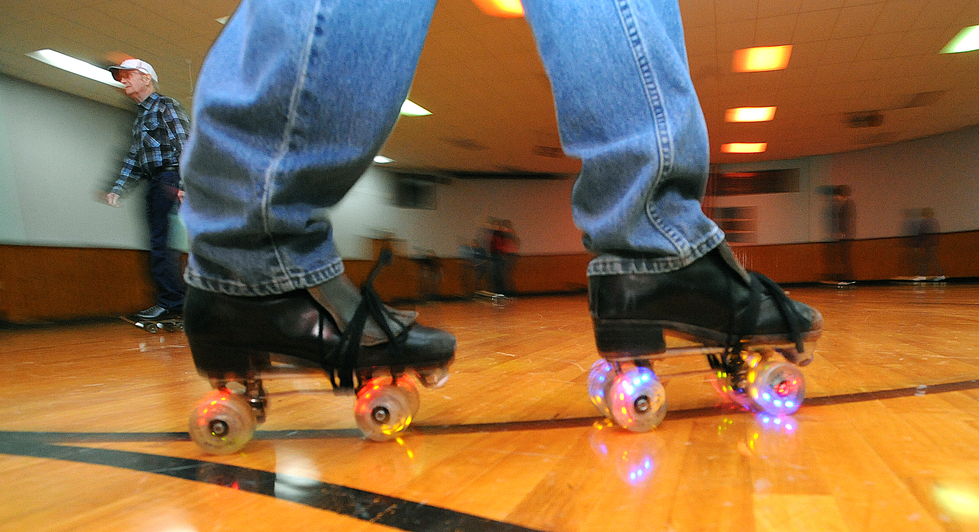 - Jose Leiva/Sun Journal Dan Brooks a regular at the Rollodrome in Auburn lights up the skating floor with his light emitting wheels.