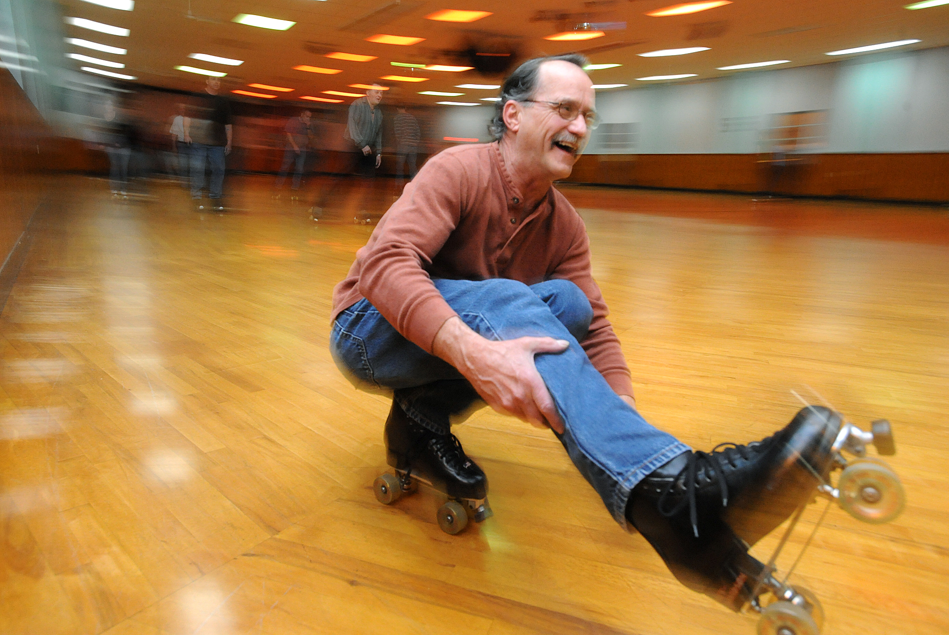 - Jose Leiva/Sun Journal Ken Carville of Lisbon Falls whizzes around the skating floor on one skate shooting the duck at the adult skate night on Thursday at the Rollodrome in Auburn.