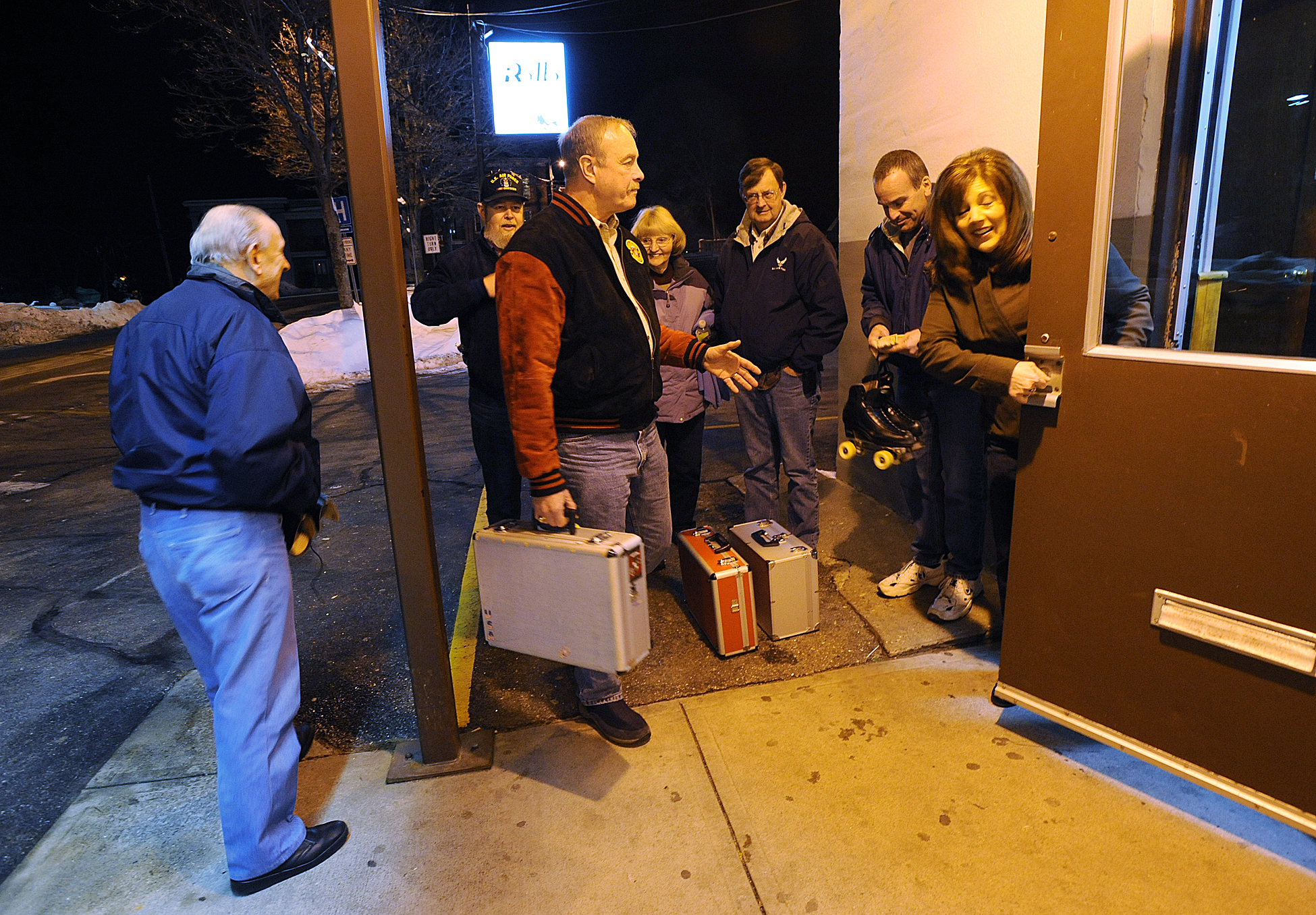 - Jose Leiva/Sun Journal Rollodrome owner Rachel Potvin right, unlocks the door for adult skaters waiting for the doors to open on Thursdays adult skate night.