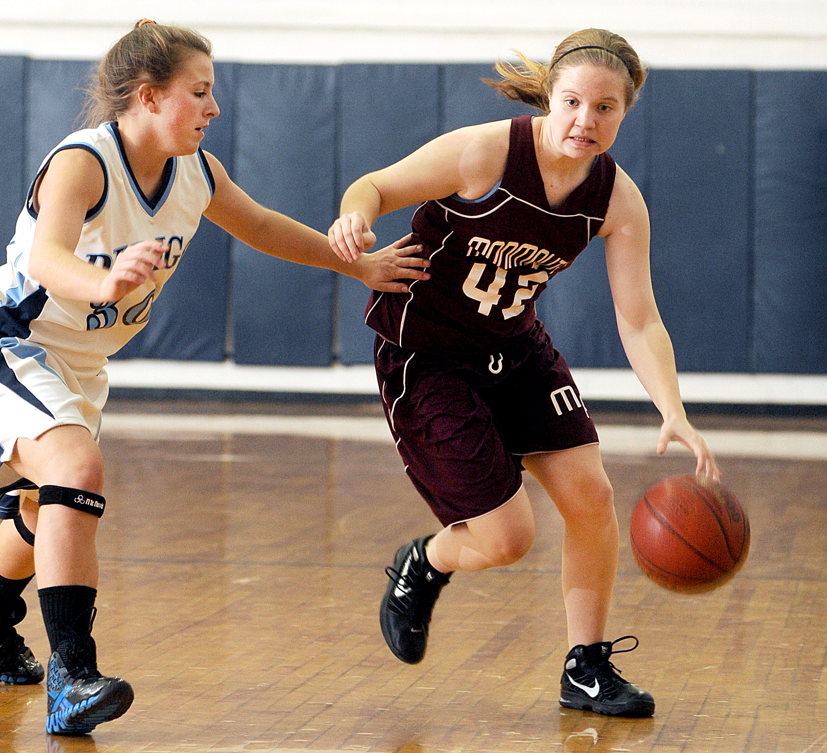 - Sierra Spencer of Monmouth Academy brings the ball up court against Erin Turner of Dirigo High School in Dixfield on Thursday.