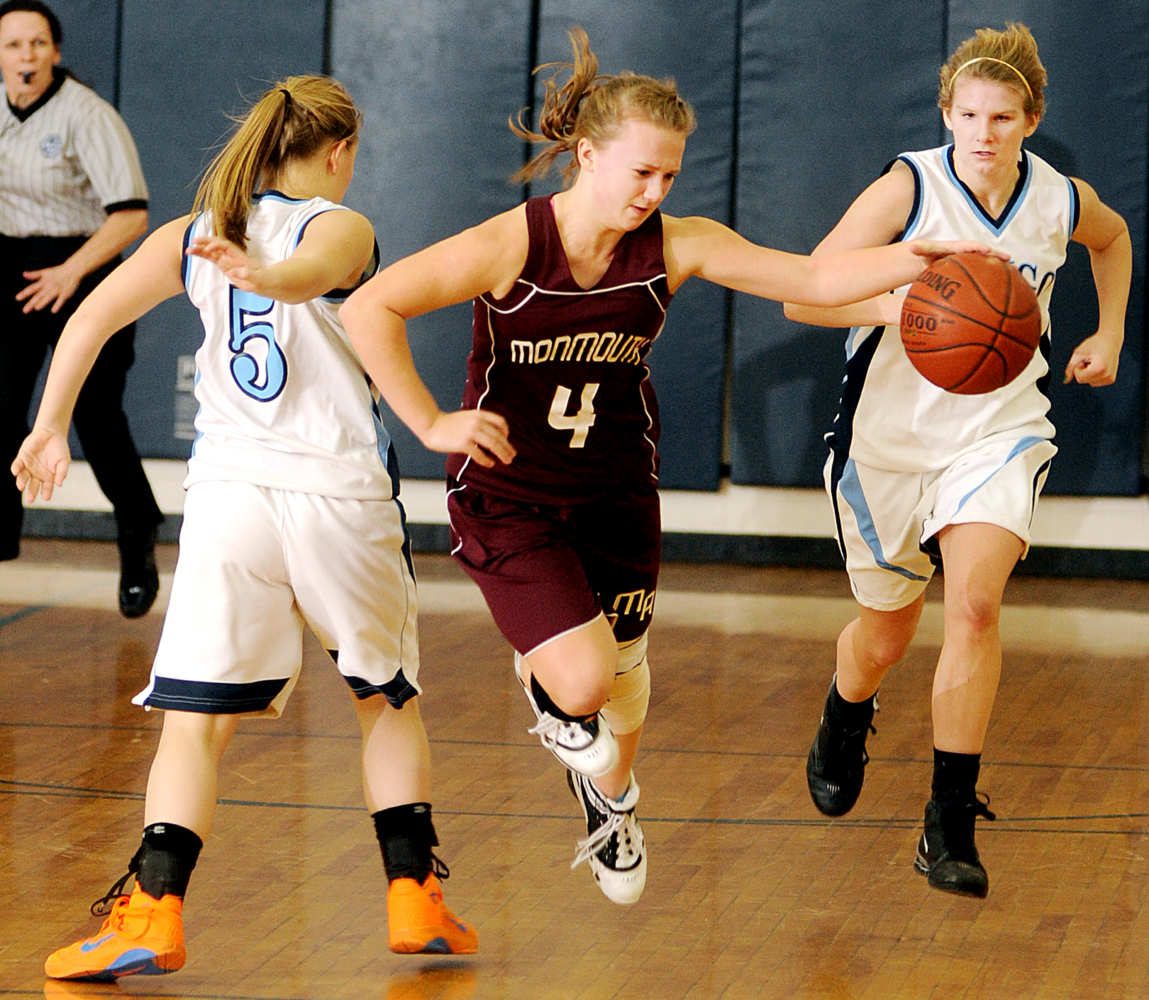 - Kylie Kemp of Monmouth Academy brings the ball up the court against Paige Murphy, left, and Hannah Knight of Dirigo High School in Dixfield on Thursday.