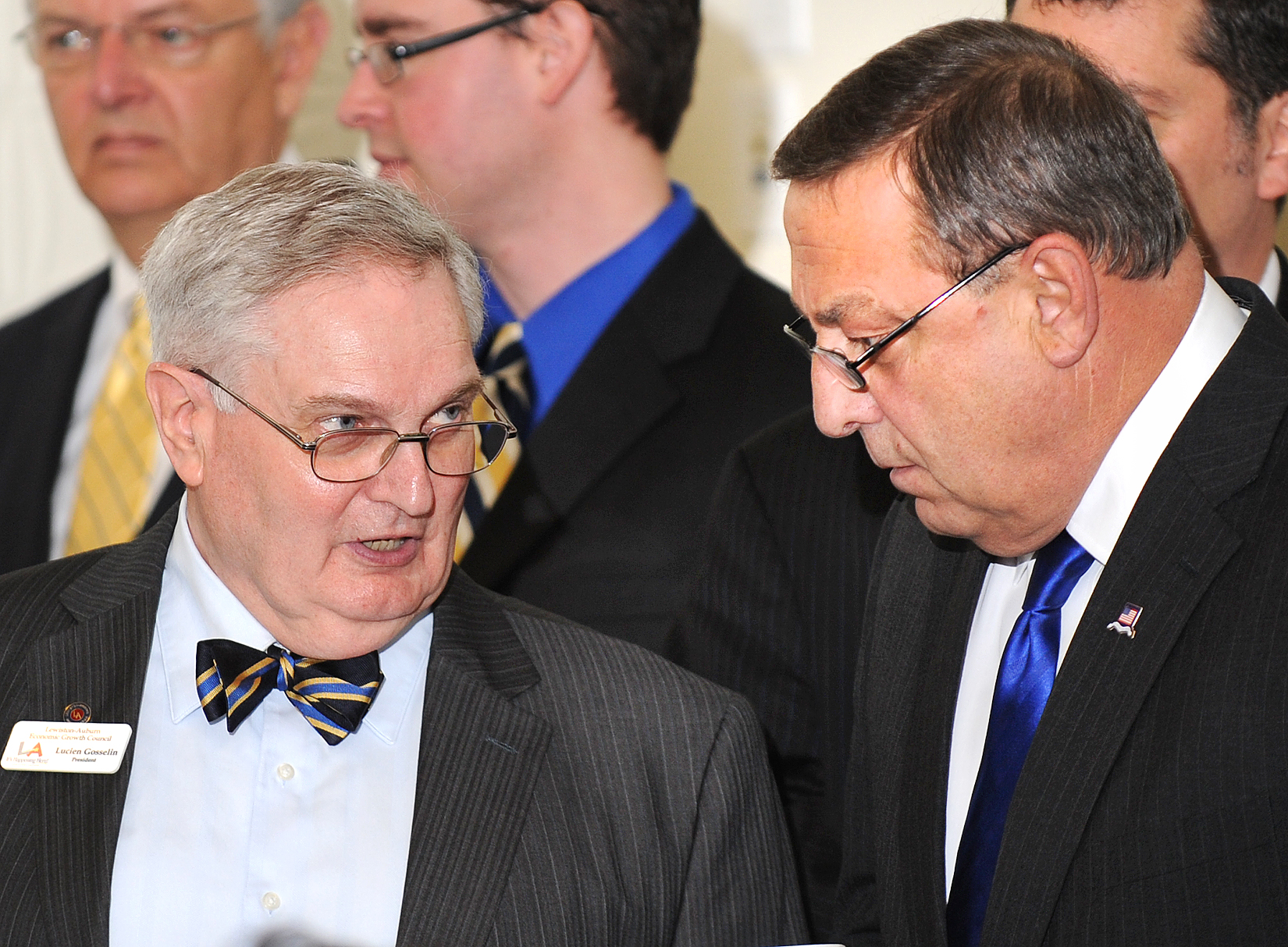 - Lewiston Economic Growth Council President Lucien Gosselin, left, talks with Governor Paul LePage Tuesday morning prior to LePage announcing that Boston based business Carbonite will bring 50 new jobs to Lewiston by the end of summer with another the possibility of up to 250 in the future.