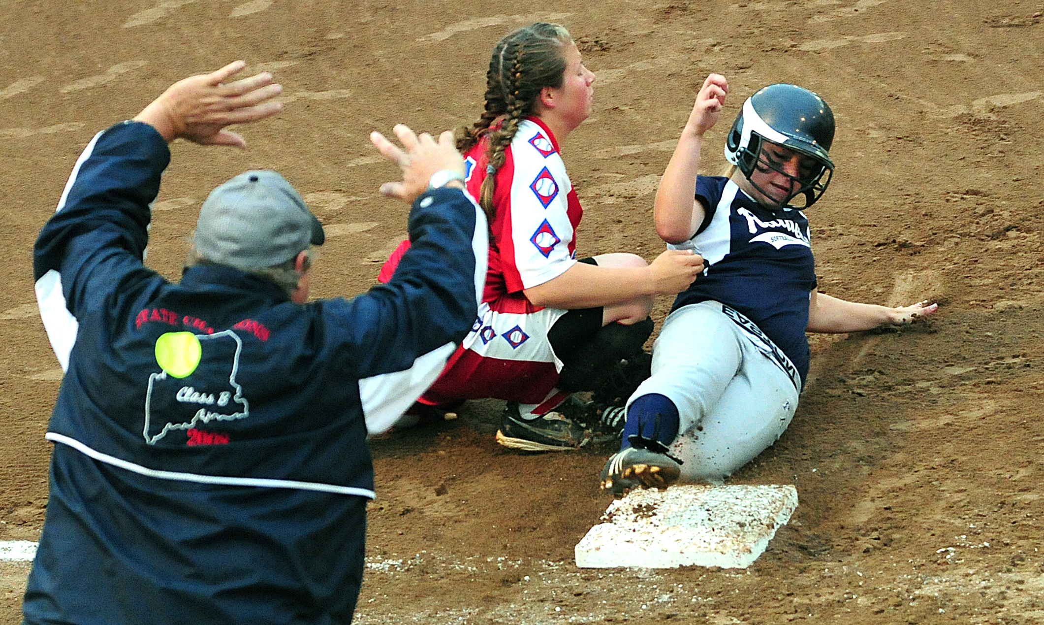 - Fryeburg’s Maddie Pearson is out at third by Oak Hill’s Alexis Priest after failing to heed head coach Fred Apt’s stop command during the Western Class B Softball Championship Tuesday at St. Joseph’s College in Standish. Fryeburg won 6-1.
