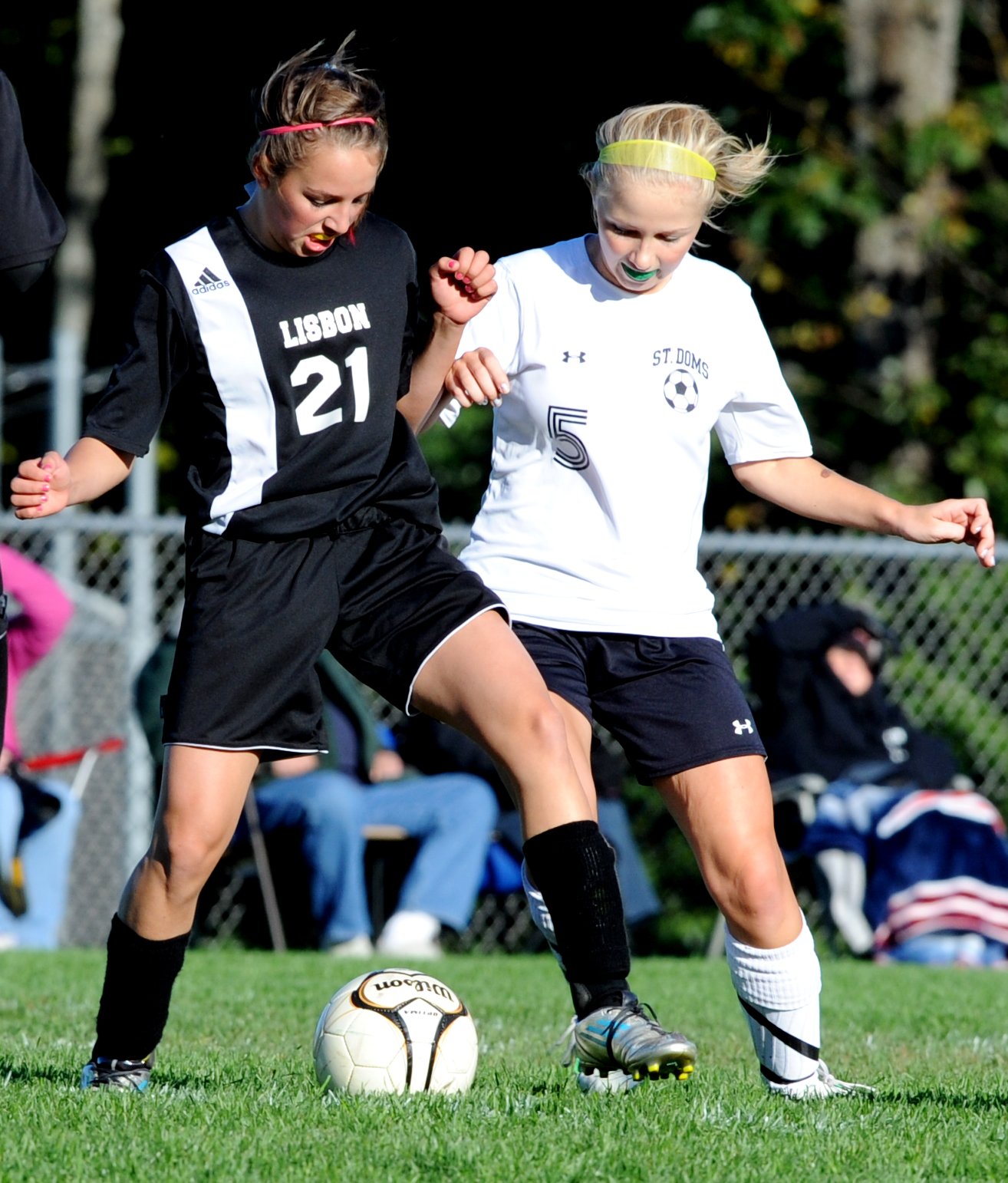 - Lisbon’s Renee Samay-Houle and St. Dom’s Kelley McLellan vie for control of the ball in the first half of their game Wednesday.