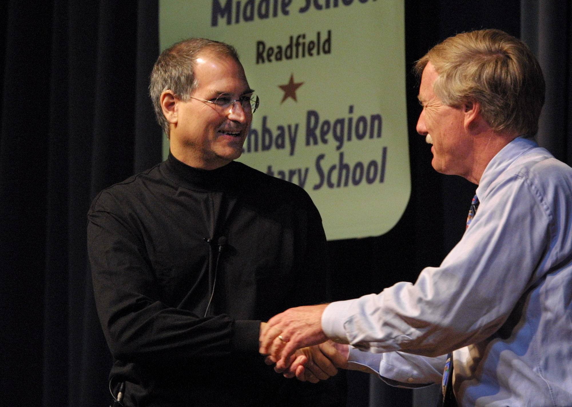 - FILE – In this June 10, 2002 file photo, (then) Gov. Angus King, right, greets Apple CEO Steve Jobs, during a visit to Portland high School, in Portland, Maine. Jobs died Wednesday, Oct. 5, 2011, at 56. (AP Photo/Joel Page, File)