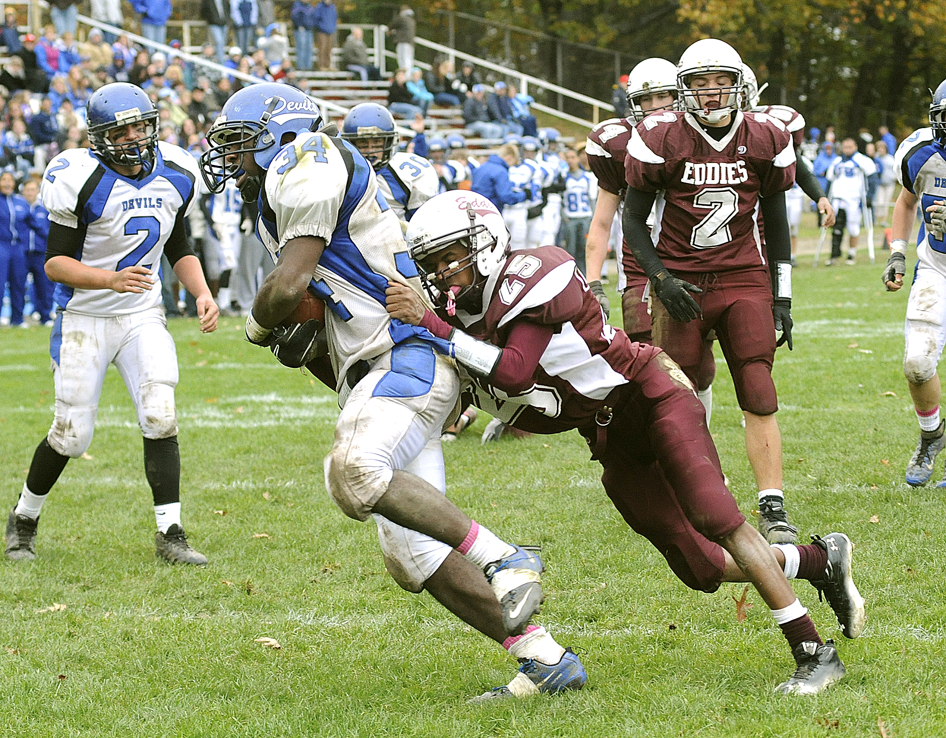 - Edward Little’s Alphonso Belnavis hangs on to Lewiston’s Jeff Turcotte as he powers through the goal line for the score in football game played at Walton Field Auburn on Saturday.