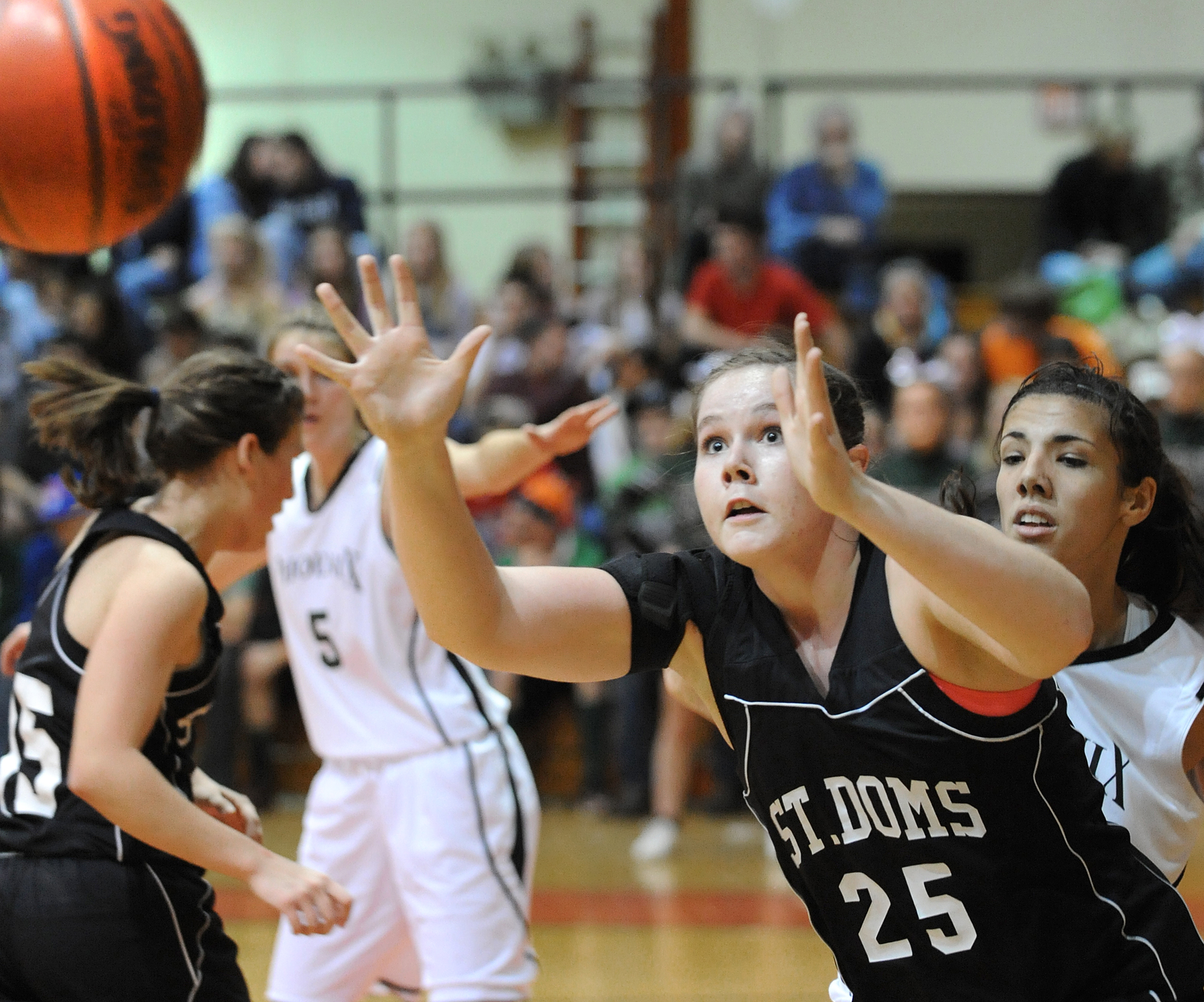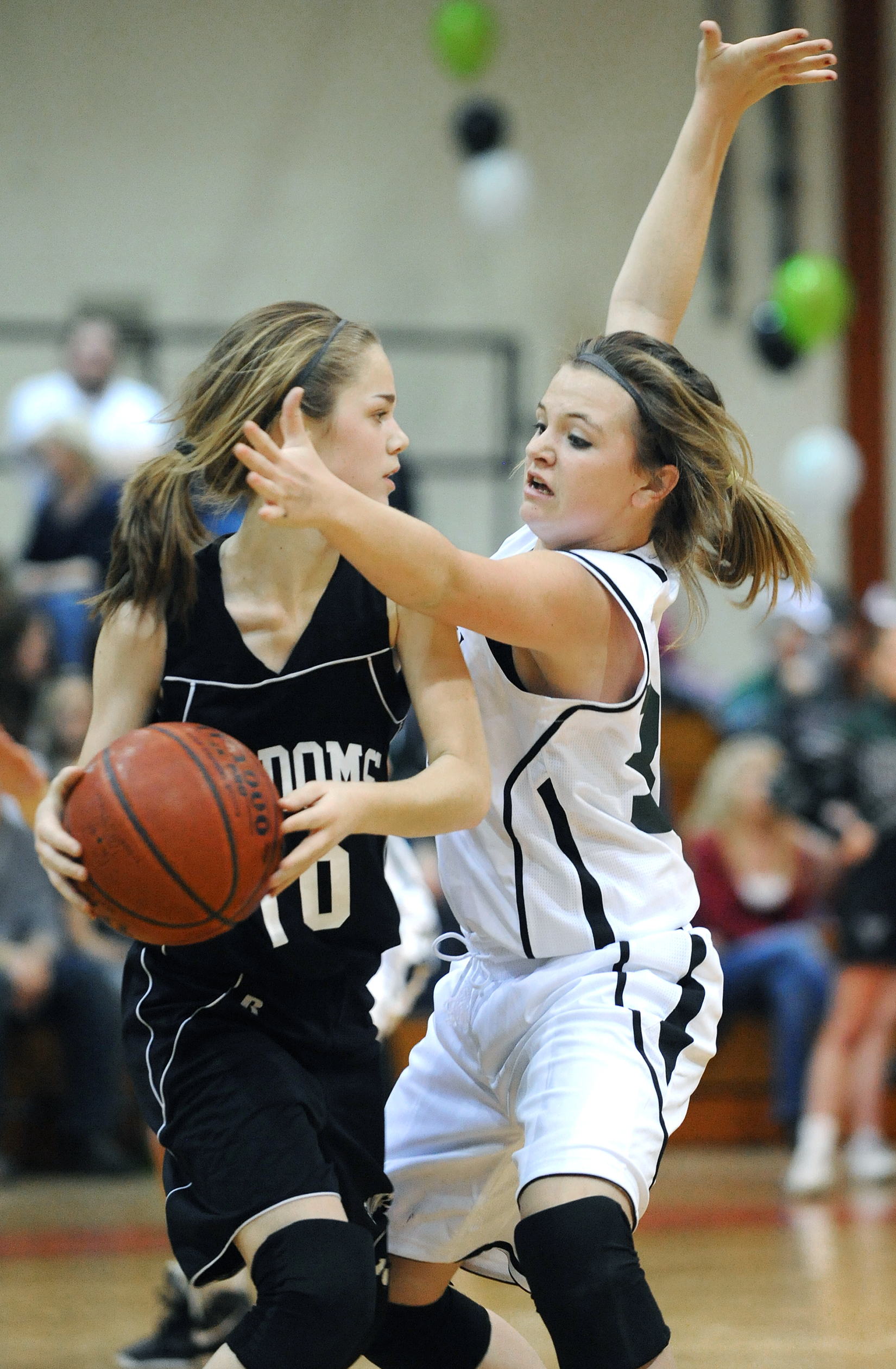 - Saint Dominic Academy’s Allison Conley concentrates as a pass from her teammate heads to her while posting up against Spruce Mountain’s Samantha Richards during Friday night’s game.