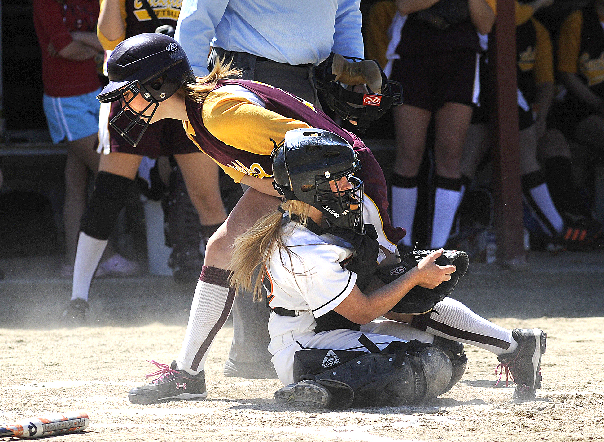 Buckfield’s Elizabeth Strout collides with Forrest Hills catcher Dana McNally at home plate in softball game played in Buckfield on Saturday. Strout was out on the play.