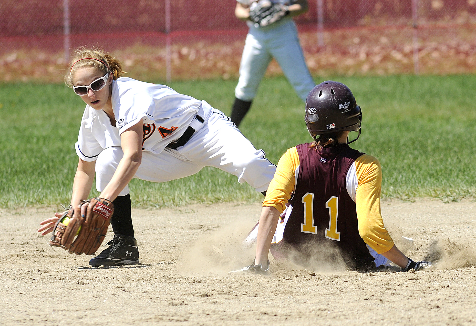 Buckfield’s Daniel Patrie beats the throw  to Forest Hills  short stop Kori Coro on a steal at 2nd base in softball game played in Buckfield on Saturday.