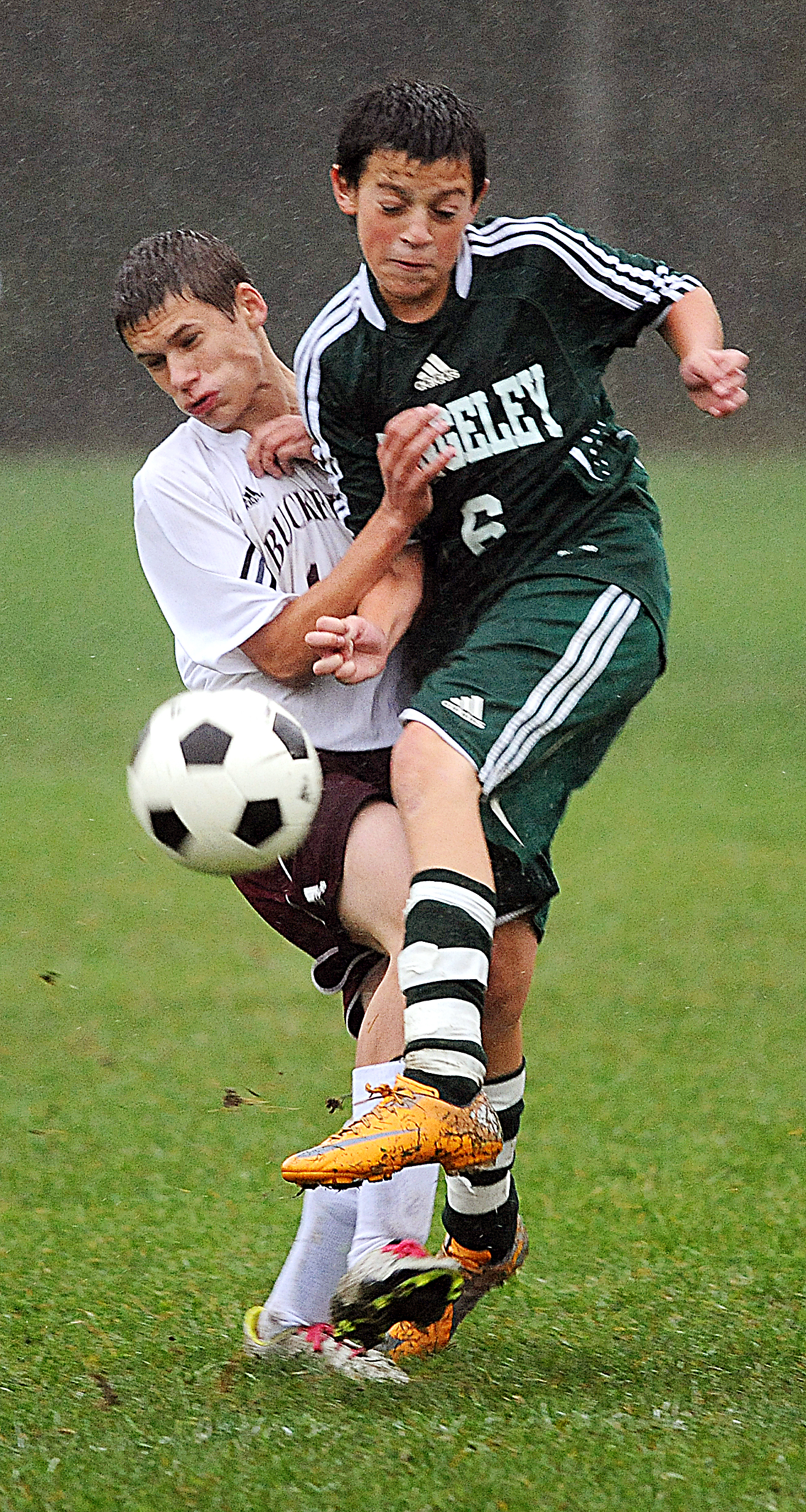 - Buckfield’s Cam Stevens collides with Rangeley’s Ricky Thompson in the first half of their soggy game Wednesday in Buckfield. Thompson was able to knock the ball away from Stevens’ control, however it went out of bounds on the play. The Bucks won 7-0.
