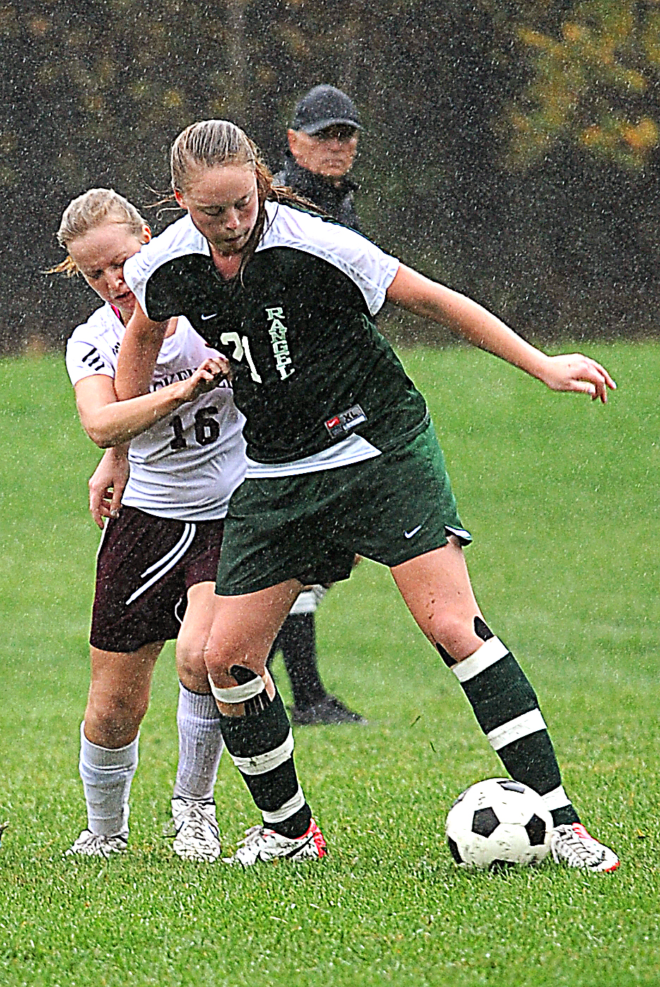 - Buckfield’s Alexis Bennett attempts to get in front of Rangeley’s Taylor Esty in a fight over the ball in the second half of their match-up Wednesday in Buckfield. Esty ended up passing the ball away from the tussle, but the Bucks went on to win 4-1.