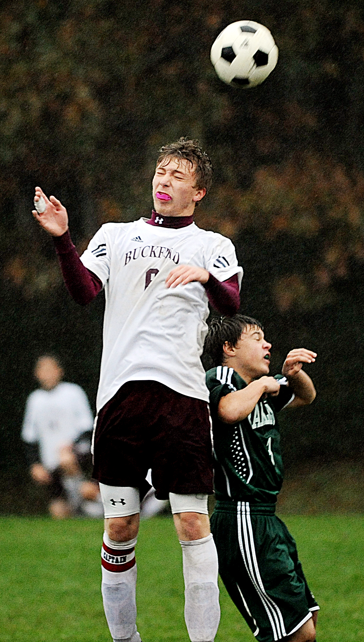 - Bucks’ Garrett Hamann heads the ball away from Rangeley’s Ricky Thompson Wednesday in Buckfield.