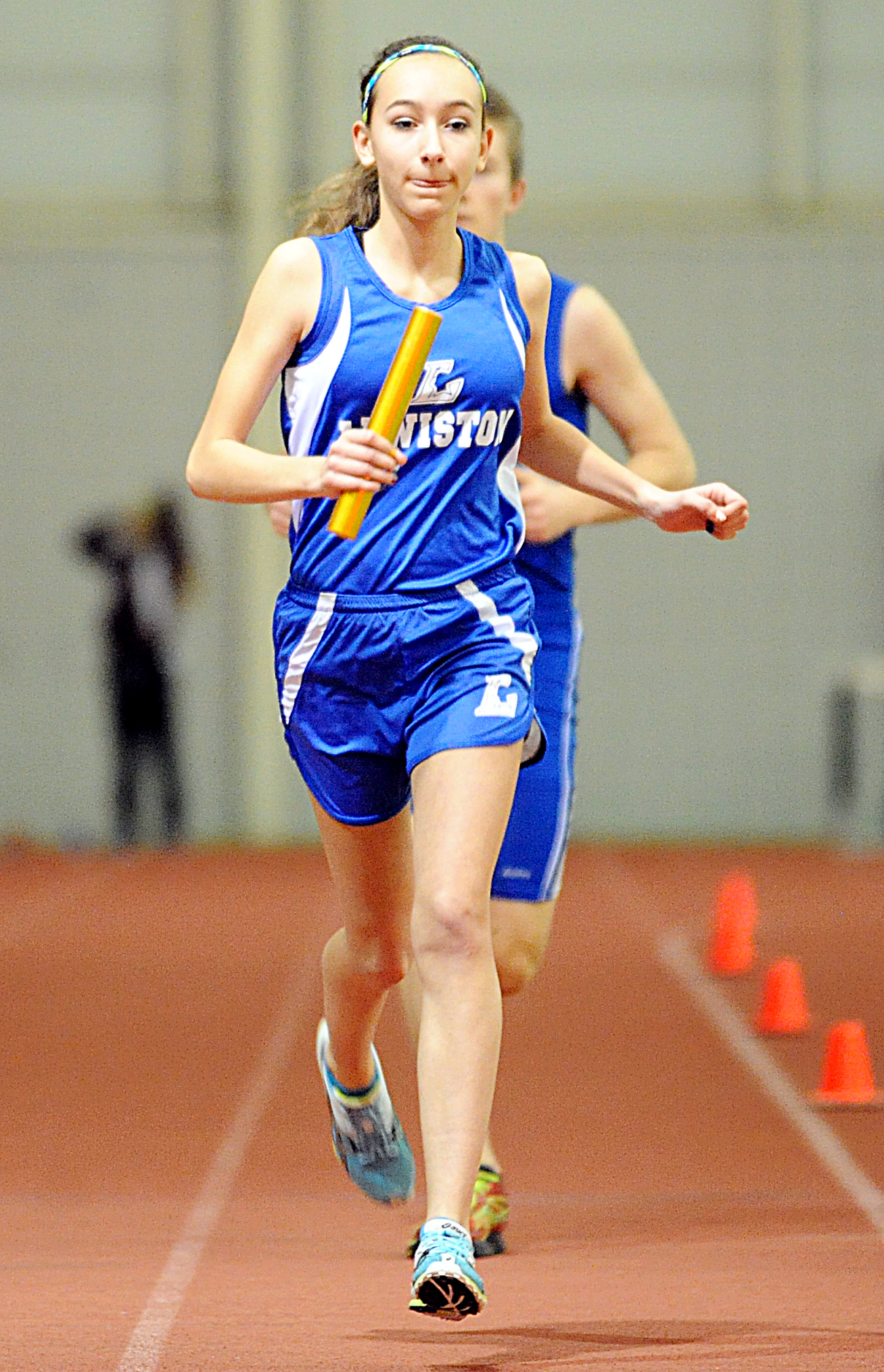 - Lewiston’s Courtney Allen takes off with the baton from teammate Lauren Lecompte in the 4×800 relay Friday in Brunswick at Bowdoin College.