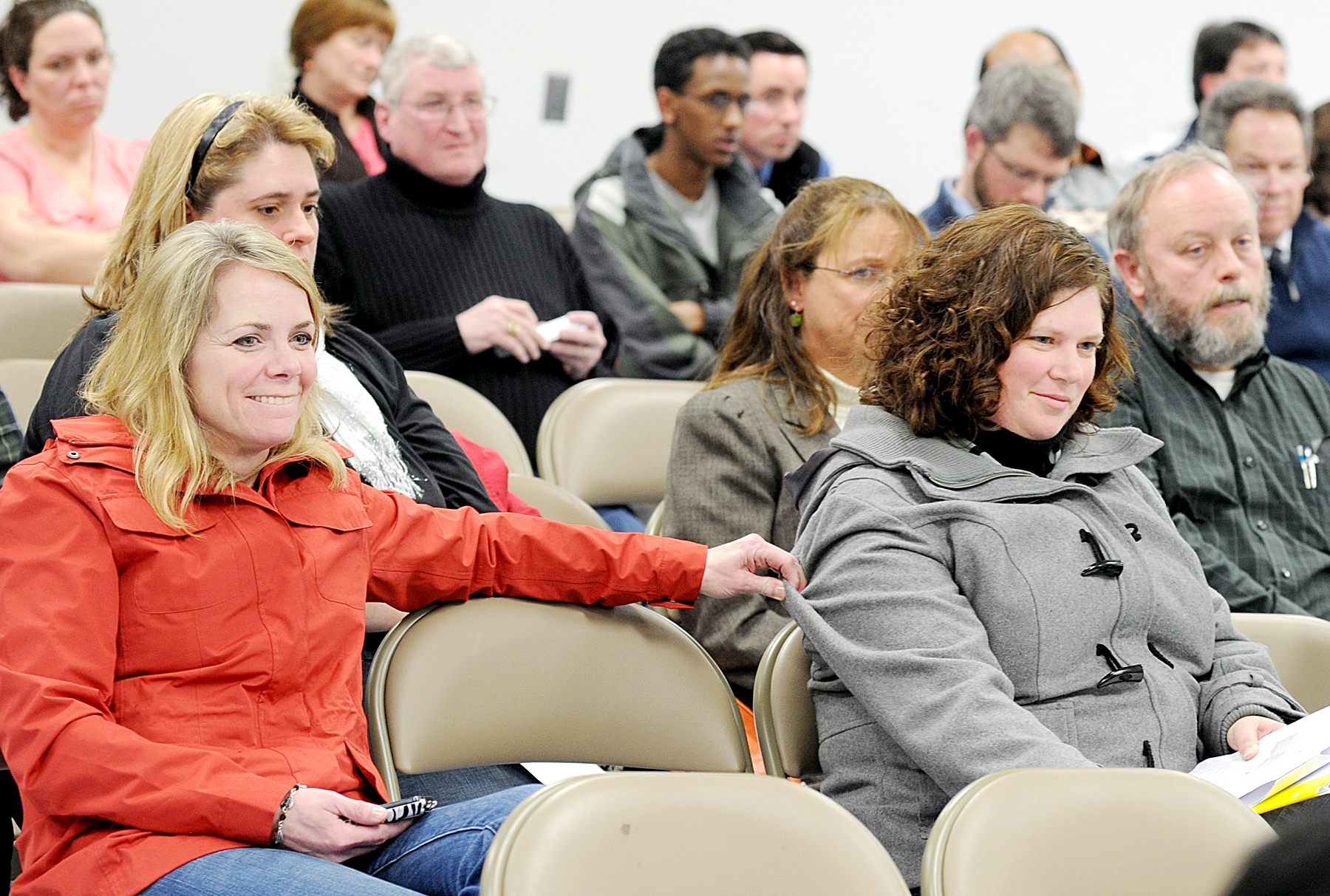 - Jodi Wolverton, left, tugs on Sarah Morin’s jacket as the Lewiston School Committee rejects the recommendation to redistrict 223 elementary students during the school committee meeting at Lewiston High School on Monday. Wolverton and Morin have children that go to McMahon Elementary School and are happy that the redistrict plan did not pass.