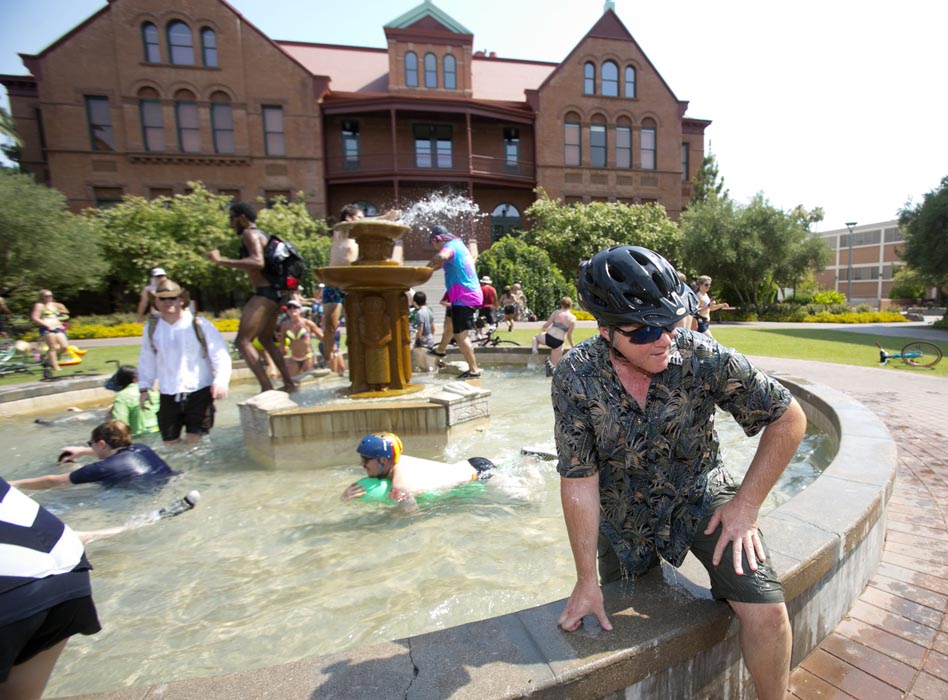 - Mark Eastwood of Tempe, Ariz. gets out of the fountain in front of Old Main on the Arizona State University campus in Tempe during the Tempe Bicycle Action Group swimsuit ride on Saturday. About 100 cyclists biked around the city cooling off in pools and fountains.