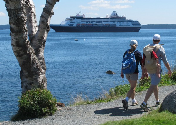 - A couple carrying a small child strolls along Bar Harbor’s Shore Path on Sunday while the cruise ship Maasdam sits anchored offshore in Frenchman Bay. According to information recently released by Cruise Lines International Association, direct spending in Maine by the cruise ship industry increased from $45 million in 2011 to $46 million in 2012.