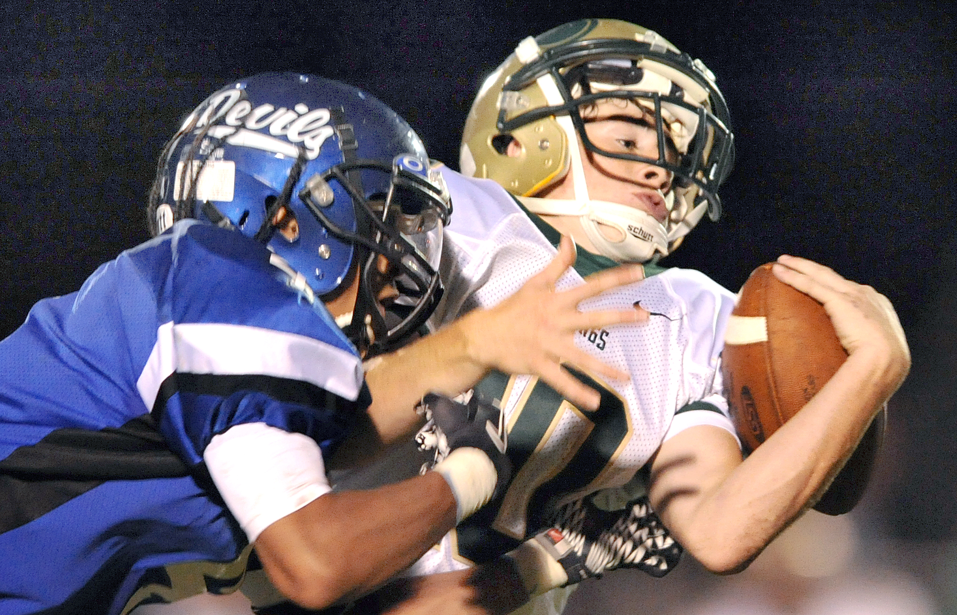 - Lewiston quarterback Eddie Emmerson gets sacked by a number of Oxford Hills players during the first half of Friday night’s game in Lewiston.