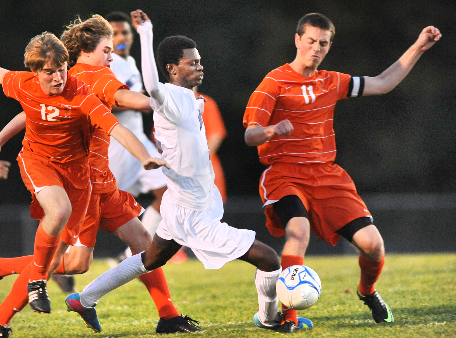 - Lewiston’s Maslah Hassan tries to thread through Brunswick defenders on his way to a shot on goal, but is tripped up by Brunswick’s Ryan Black during Thursday night’s game in Lewiston.
