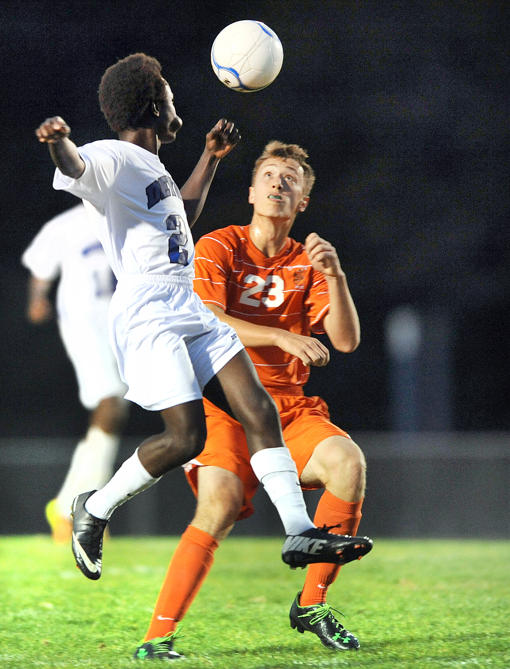 - Lewiston’s Kwabena Akuffo-Anoff heads the ball past Brunswick’s Phillip LeBlanc during Thursday night’s soccer match in Lewiston.