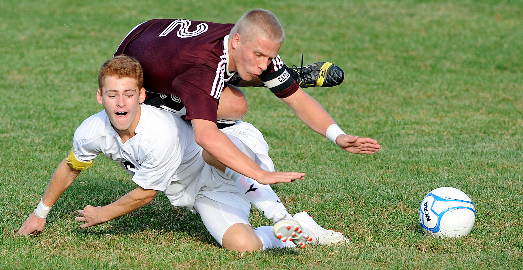 - Saint Dominic Academy’s Calvin Stewart, left and Monmouth’s Kyle Fletcher take each outher out of the play as they go for a 50/50 ball during Friday afternoon’s boys soccer game in Auburn.