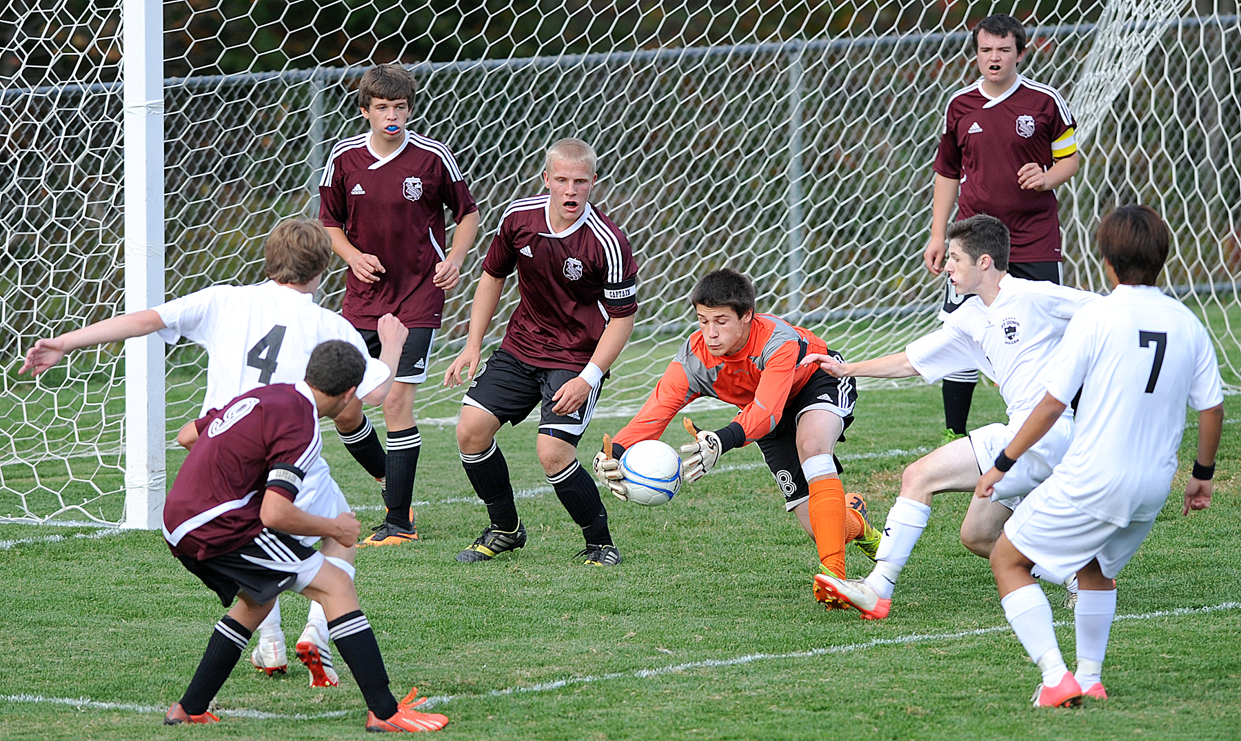 - Monmouth goalie Kasey Smith dives on a loose ball in front of his net during Friday night’s boys soccer game against Saint Dominic Academy. While Smith made numerous key saves, the Saints won the game 2-0.