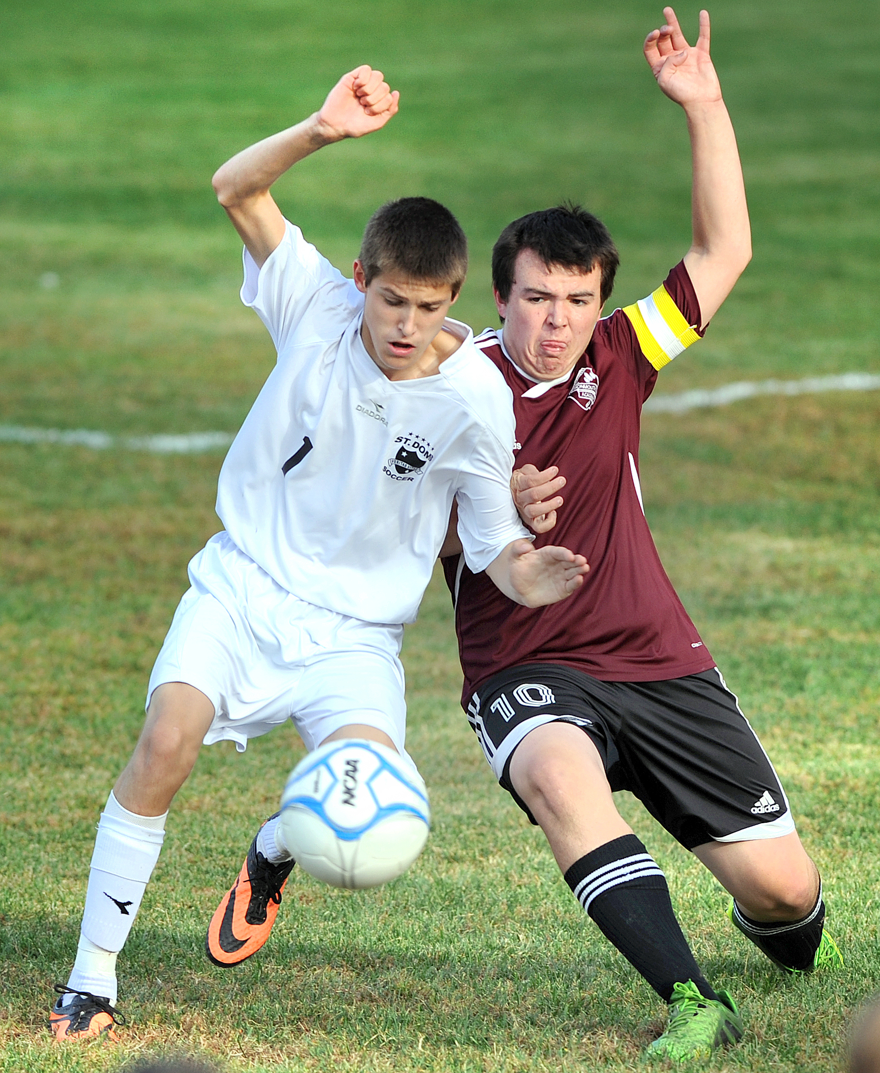 - Saint Dominic Academy’s Austin Roy, left and Monmouth’s Joseph Menice battle for the ball during Friday afternoon’s game in Auburn.
