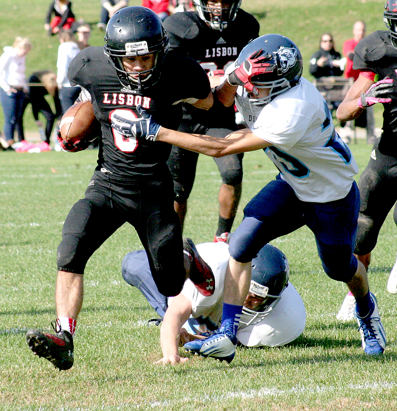 - Jordon Torres (6) of Lisbon stiffarms Michael Casey of Dirigo on his way to a 7-yard gain during the first half of their game in Lisbon on Saturday. Lisbon won in overtime, 22-14.