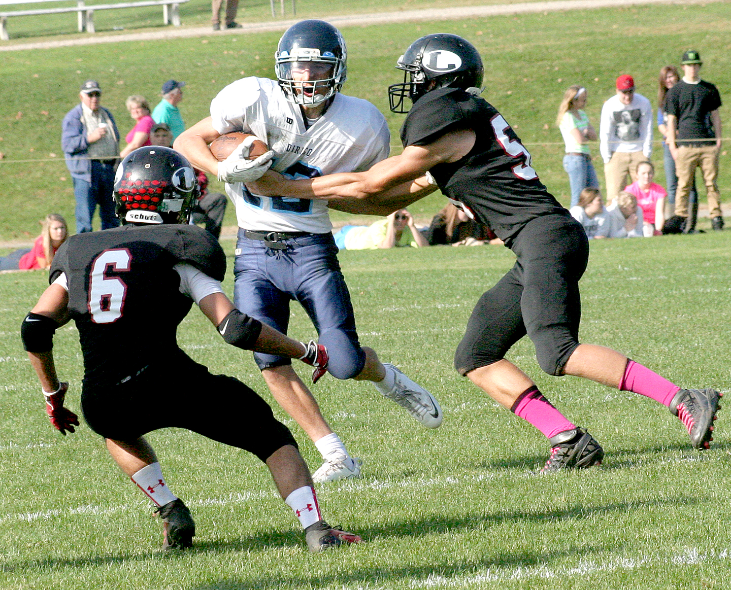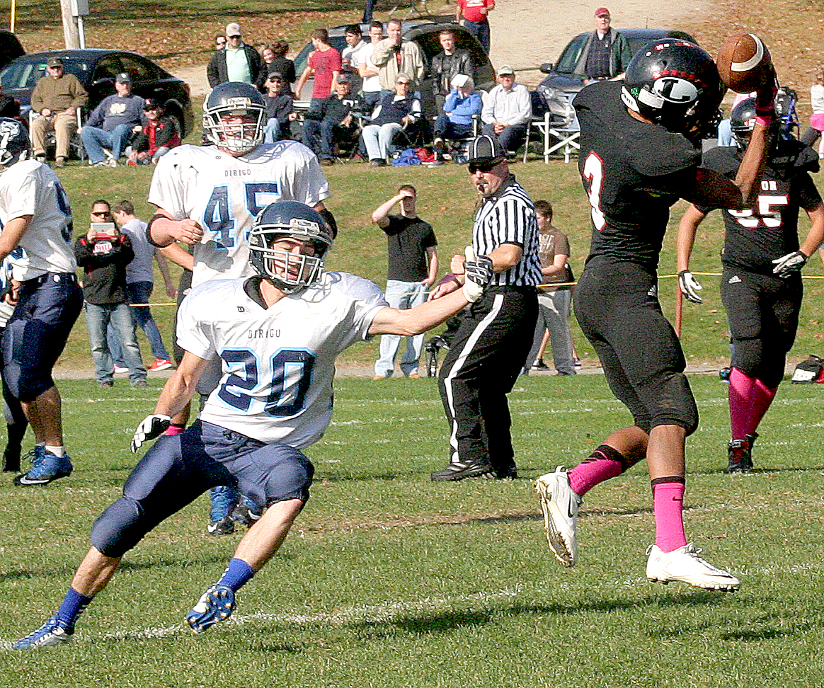 - Jordan Glover (3) of Lisbon hauls down a pass from quarterback Kyle Bourget in front of Dirigo’s Michael Casey during the first half of their game in Lisbon on Saturday.