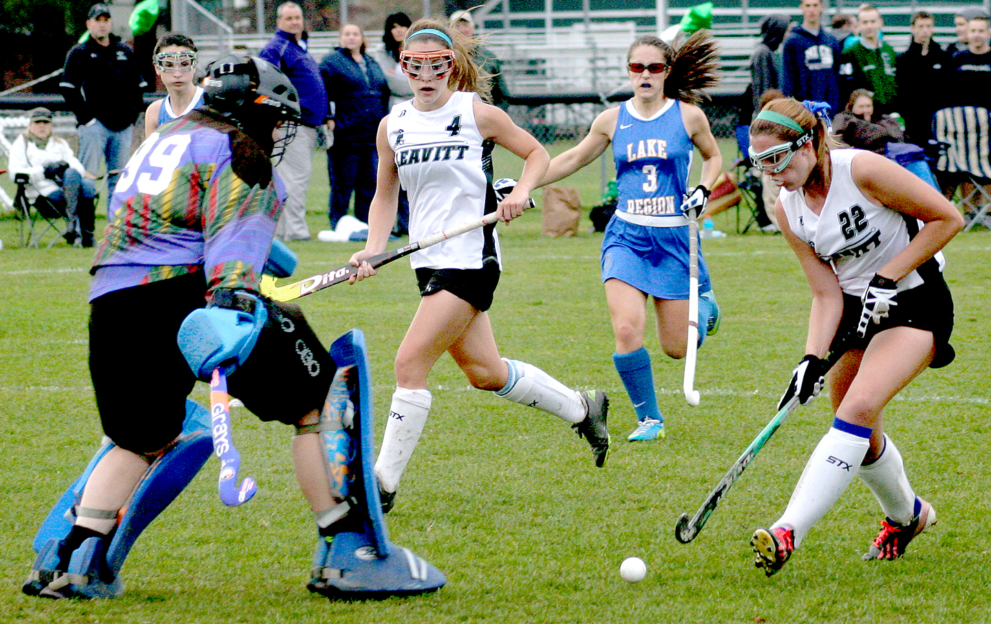 - Kierstin Leclerc (22) of Leavitt makes a move on Lake Region goalie Meghan VanLoan as Leavitt’s Sadie Royer (4) and Lake Region’s Courtney Yates give chase during their game in Turner on Tuesday.