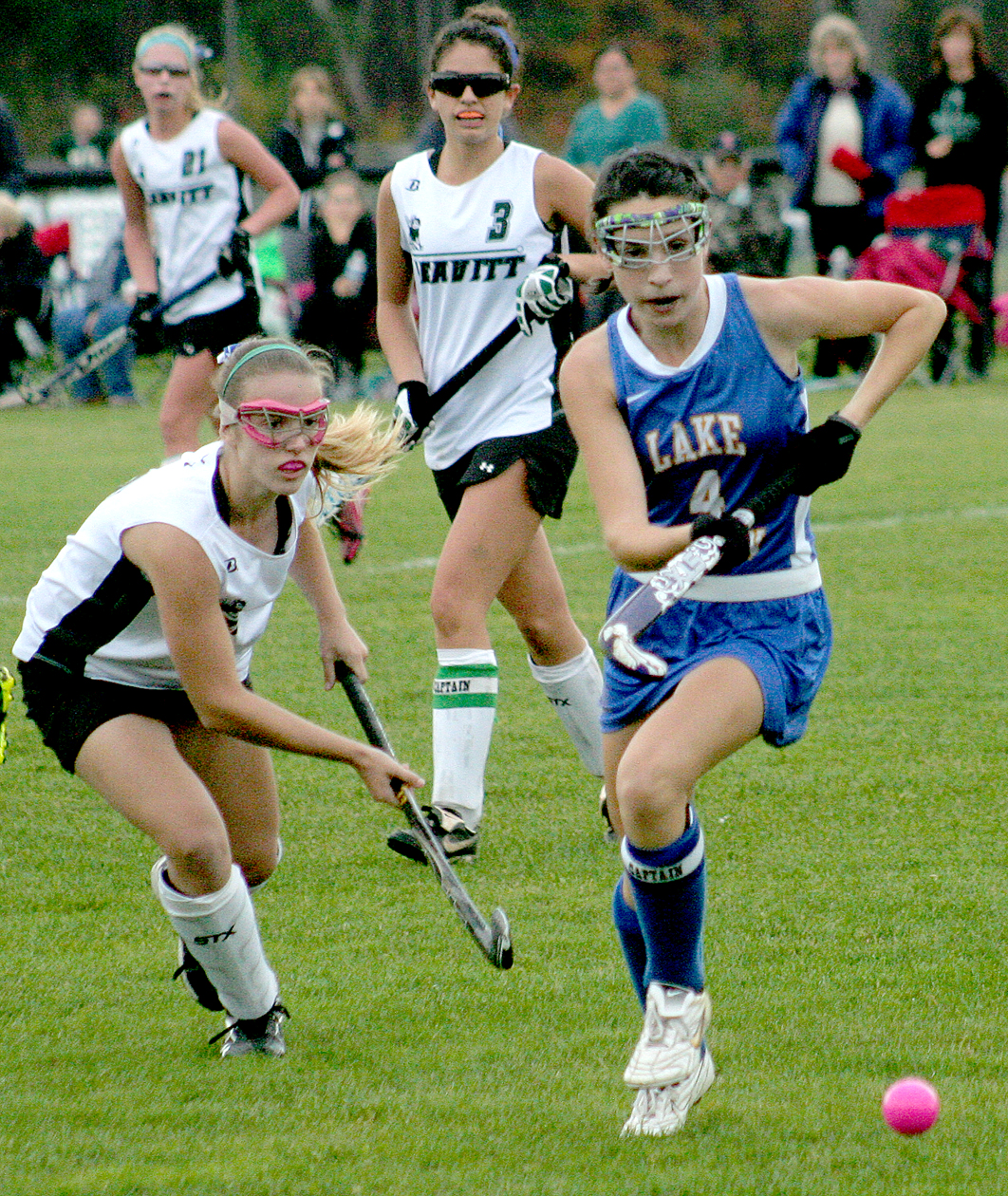 - Leavitt’s Emma Fournier, left, and Lake Region’s Casey Heath go after the ball during their Werstern Class B quarterfinal field hockey game in Turner on Tuesday.