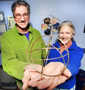 - David Dobson and Kristine Schares hold a Genesa crystal made by Dobson at their home in Windham. The couple owns Golden Ray Energetics, a company that specializes in remote-energy house-clearings. They say they’ve worked on homes as far away as Sweden, mentally cleaning out and capping off bad energy.