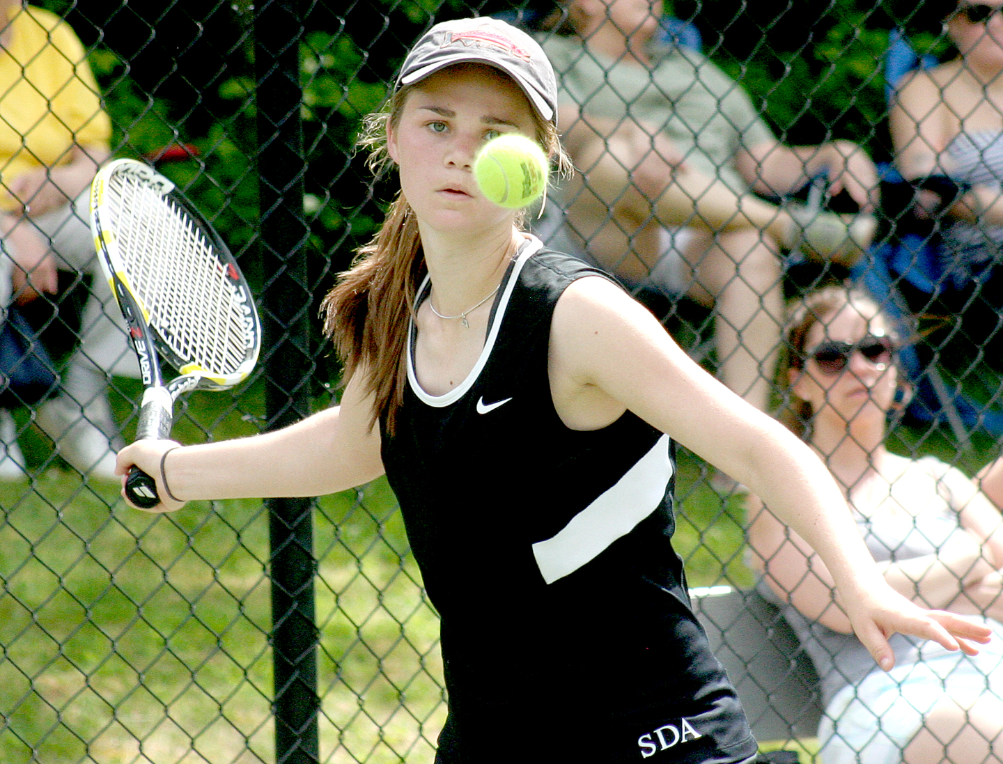 - St. Dominic Academy senior Callie Greco returns the ball to Winthrop freshman Megan Chamberland during their match at No. 2 singles in a Western Class C semifinal in Auburn on Saturday. Chamberland won the match, 6-4, 6-4.