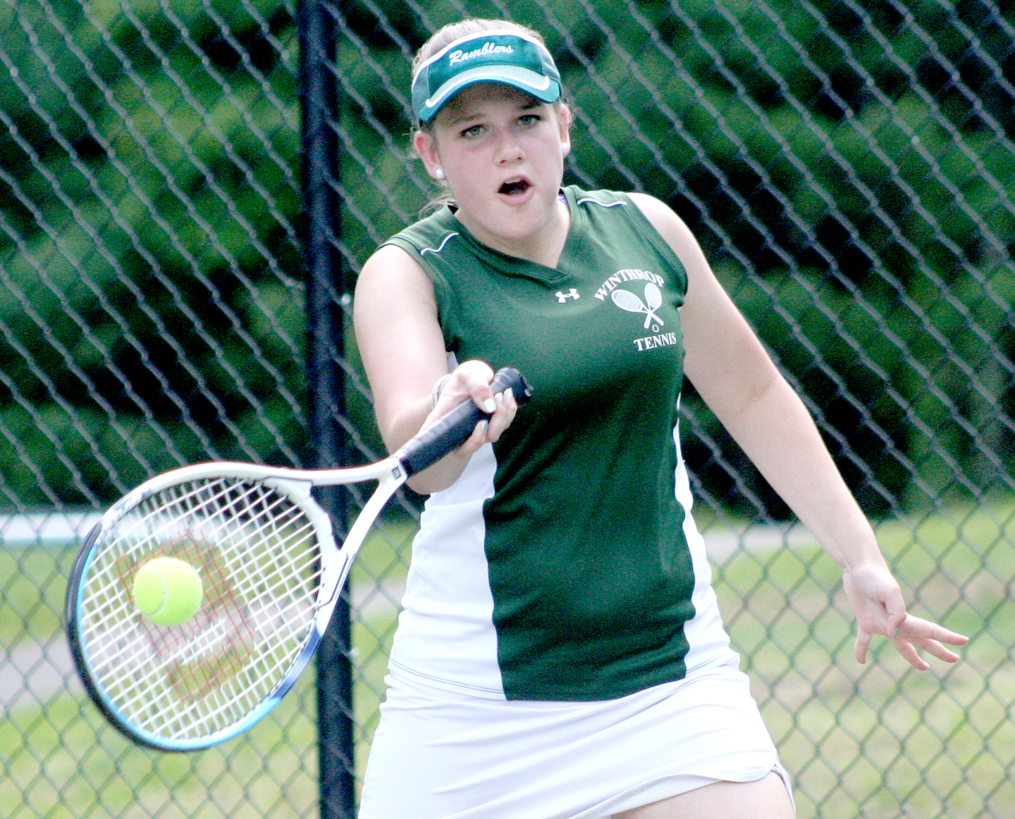- Winthrop freshman Megan Chamberland returns a shot to St. Dominic Academy’s Callie Greco during their match at No. 2 singles in a Western Class C semifinal in Auburn on Saturday. Chamberland won the match, 6-4, 6-4.