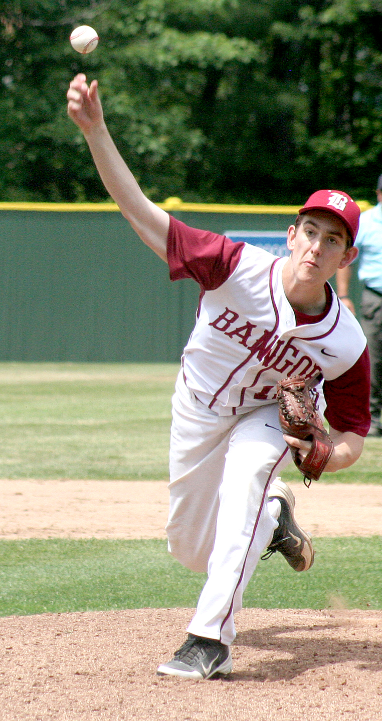 - Bangor pitcher Justin Courtney delivers a pitch to a Windham batter during the Class S state baseball championship game Saturday at St. Joseph’s College in Standish. bangor won, 8-0.
