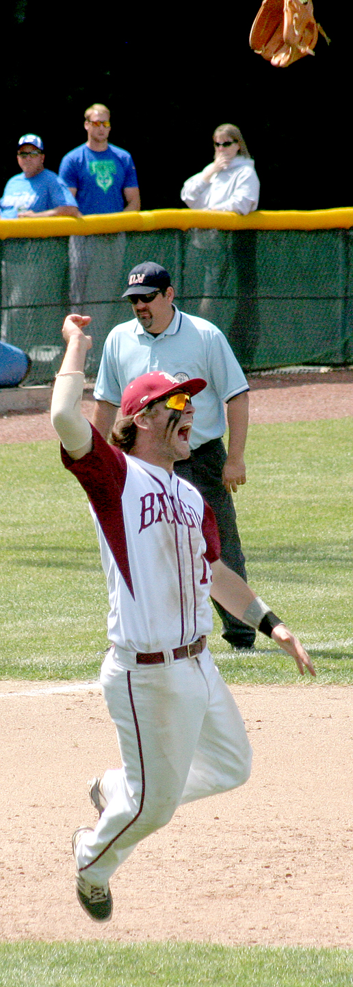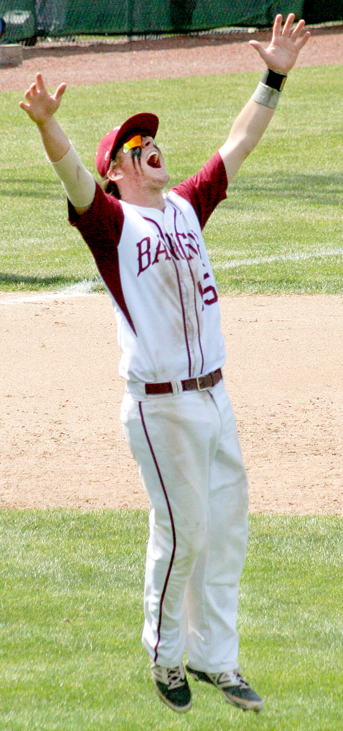 - Bangor third baseman Sam Huston celebrates after the final out of the Class A state baseball championship game Saturday at St. Joseph’s College in Standish. Bangor won, 8-0.