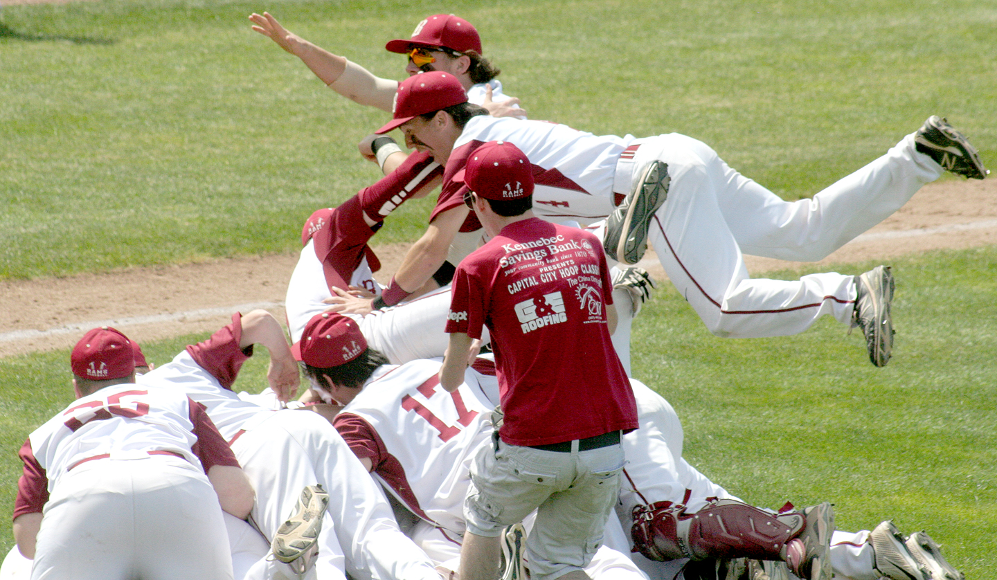 - Bangor’s Jordan Derrah (9) joins the pileup late as the Rams celebrare winning the Class A state baseball championship game Saturday at St. Joseph’s College in Standish. Bangor won, 8-0.