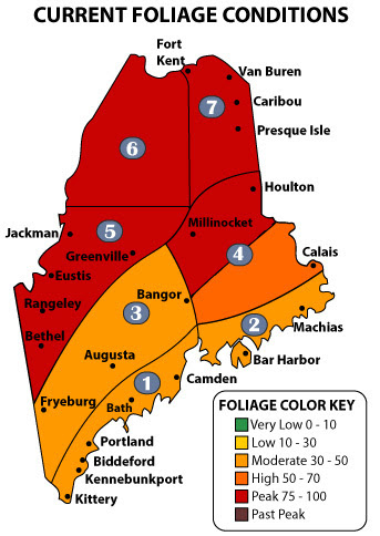 Maine Department of Agriculture, Conservation and Forestry reports moderate to high color spreading throughout Maine with low leaf drop this weekend.