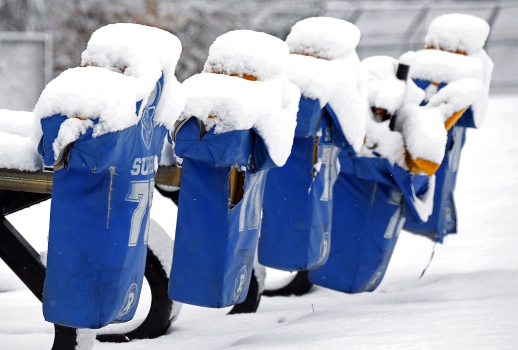 A football blocking sled is coated with snow at Murrah High School, Friday, Dec. 8, 2017, in Jackson, Miss. Forecasters anticipate continued snowing throughout much of the central and southern Mississippi until noon. (AP Photo/Rogelio V. Solis)