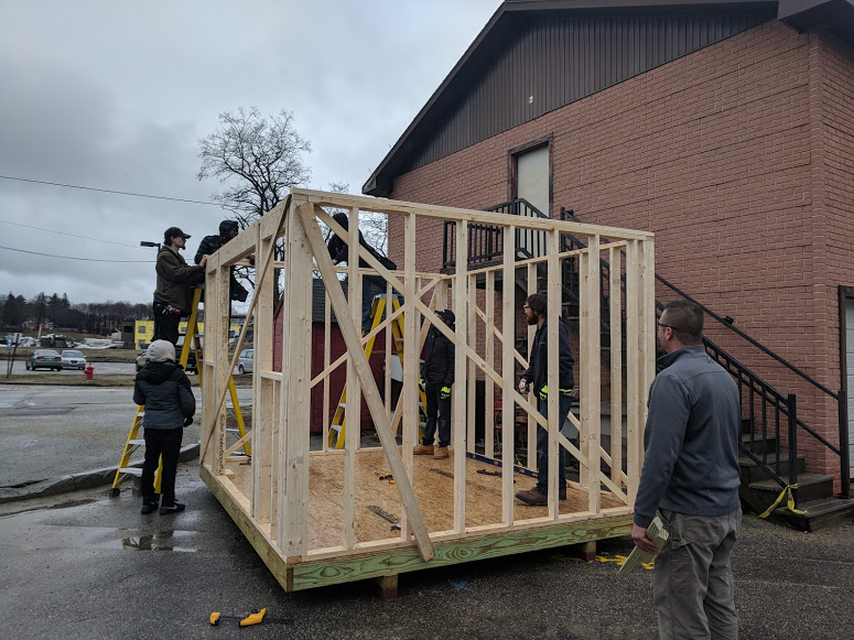 Instructor Jason Merritt supervises students in his adult education construction class recently. The team has been building a shed in the Lewiston High School lot. (Mark LaFlamme/Sun Journal)