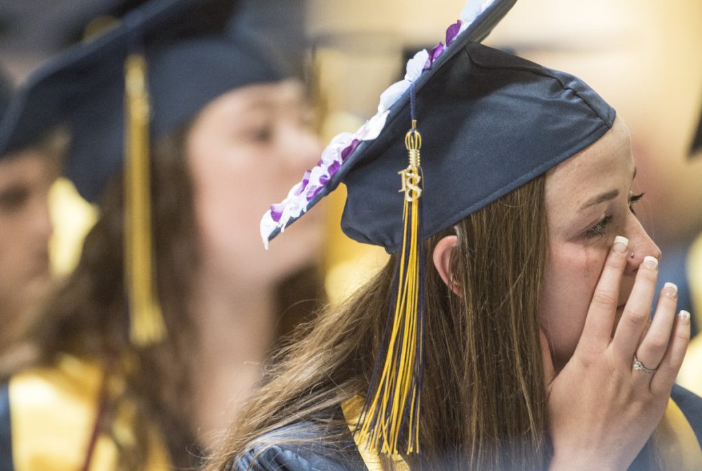 Gracie Foss sheds a tear during Mt. Blue High School commencement ceremonies at Mt. Blue High School in Farmington on Sunday. (Michael G. Seamans/Morning Sentinel)