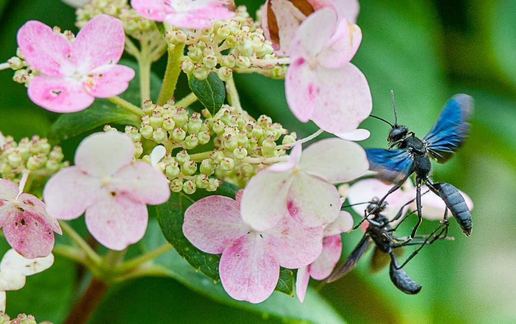 A pair of wasps battle next to flowers surrounding the bandstand behind the Marion T. Morse School in Lisbon on Wednesday afternoon. (Russ Dillingham/Sun Journal)