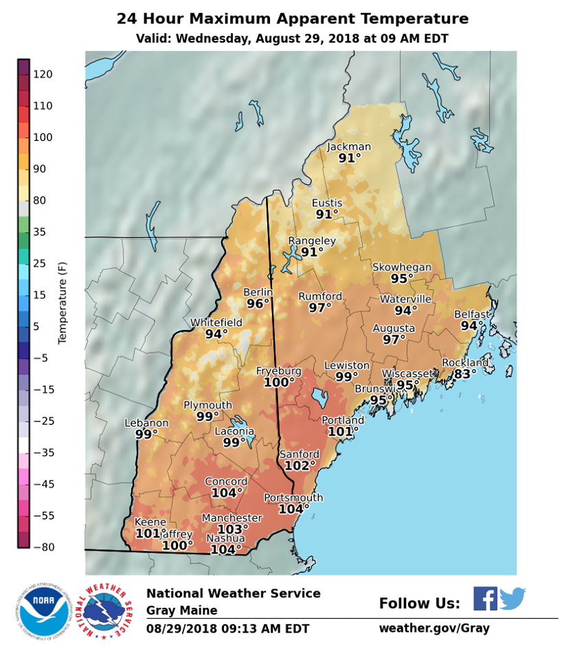 Because of the latest dose of hot air, the National Weather Service issued a heat advisory for Maine that will be in effect from noon Tuesday until 8 p.m. Wednesday, and the Maine Department of Environmental Protection issued a warning that ground-level ozone concentrations will reach unhealthy levels.