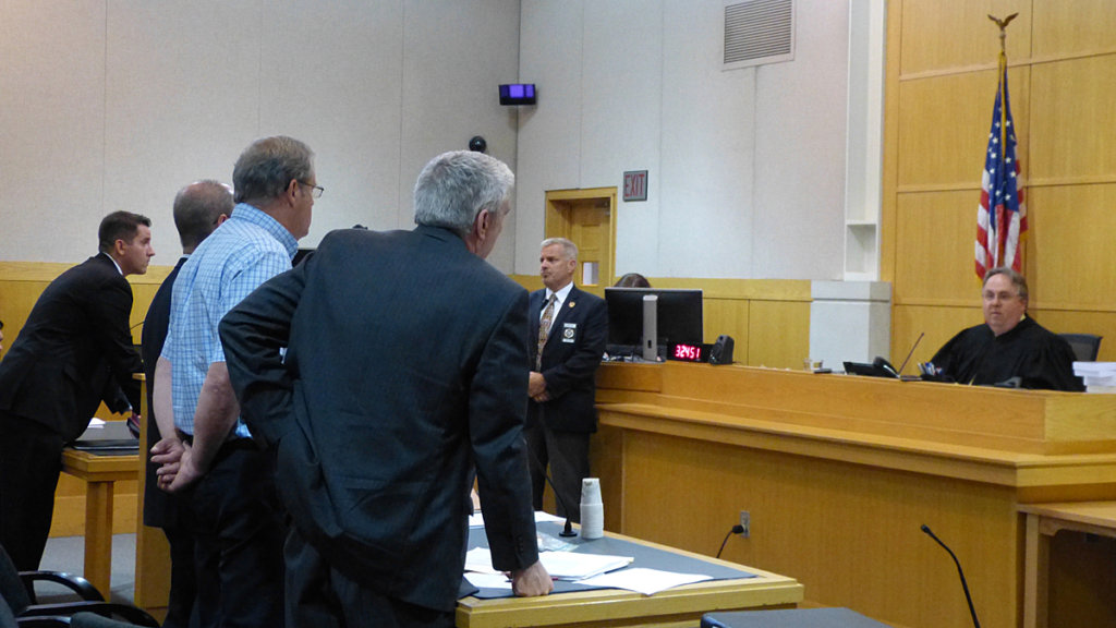 Justice Daniel Billings sentences Robert Welch of Topsham, standing third from left with hands behind his back, to 10 years incarceration and six years of probation, in West Bath District Court Wednesday. (Darcie Moore/Times Record)