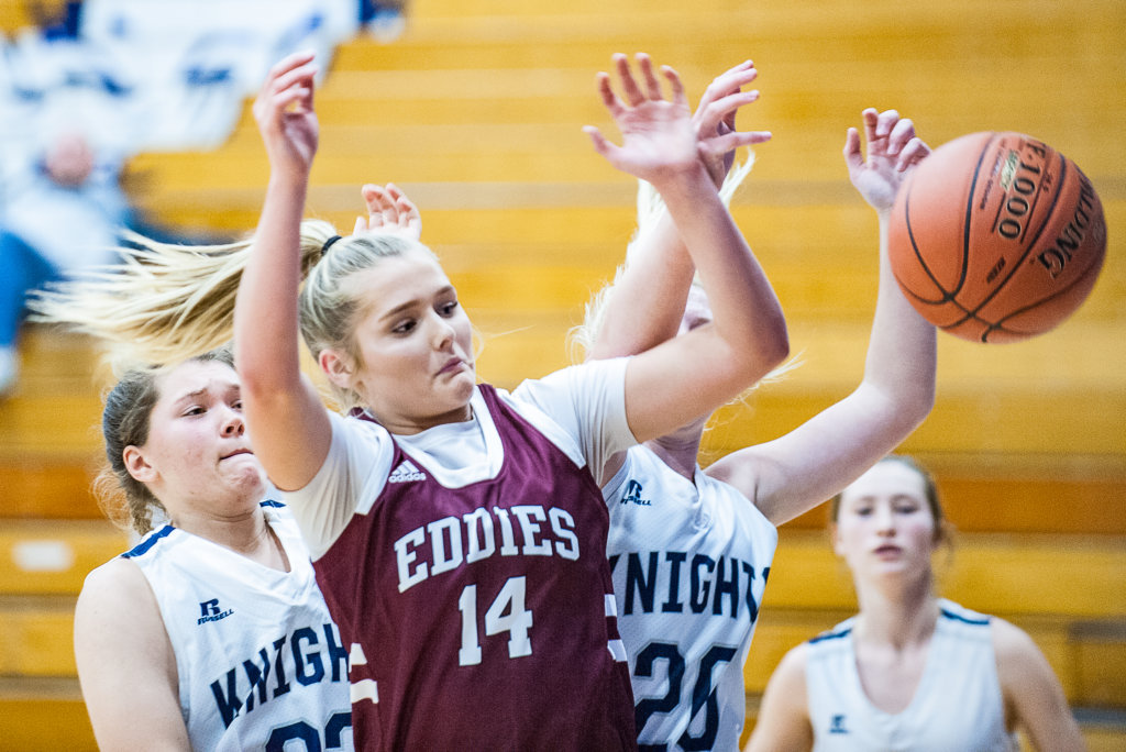 Edward Little’s Grace Fontaine battles with Poland’s Liz Tibbetts left and Sophia Vallee for a rebound during one of 5 games in the 11th annual Auburn-Lewiston Sports Hall of Fame Gippers Basketball Tip-Off Classic at Lewiston High School that continues Saturday with 6 more games starting at 11:30 am. (Russ Dillingham/Sun Journal)