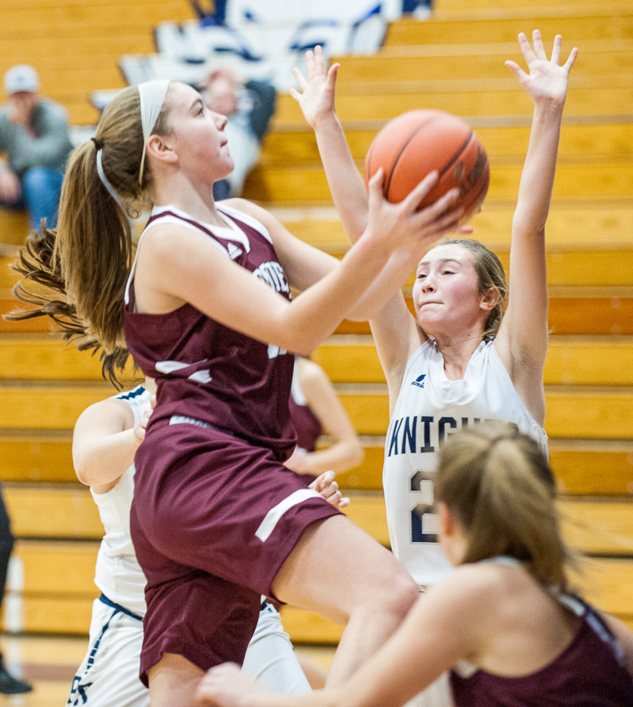 Edward Little’s Jade Perry drives to the basket for a layup while being defended by Poland’s Emma Gagne, right during one of 5 games in the 11th annual Auburn-Lewiston Sports Hall of Fame Gippers Basketball Tip-Off Classic at Lewiston High School that continues Saturday with 6 more games starting at 11:30 am. (Russ Dillingham/Sun Journal)