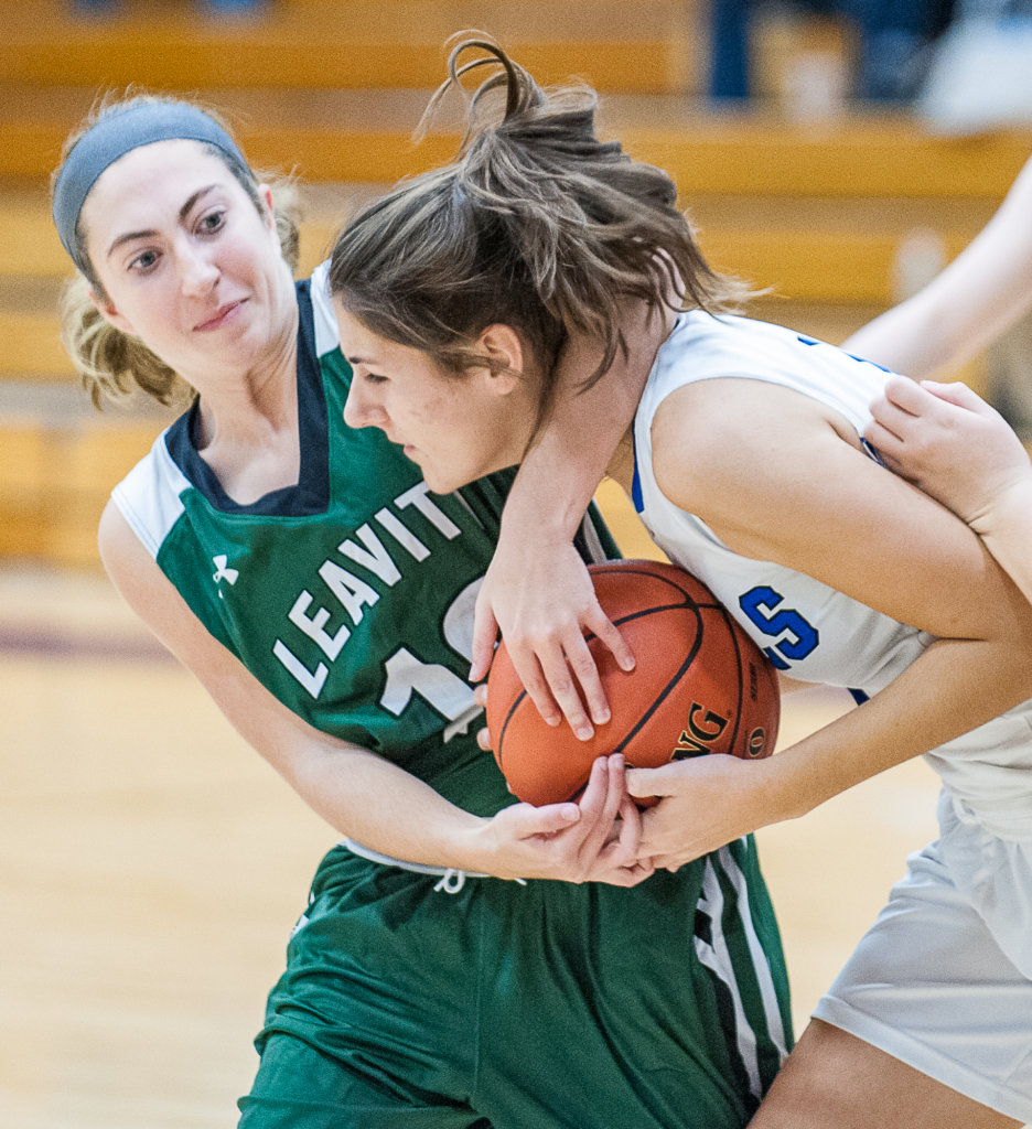 Lewiston’s Lauren Foster, center, wrestles the ball away from Leavitt’s McKenna Redstone, during one of 5 games in the 11th annual Auburn-Lewiston Sports Hall of Fame Gippers Basketball Tip-Off Classic at Lewiston High School that continues Saturday with 6 more games starting at 11:30 am. (Russ Dillingham/Sun Journal)