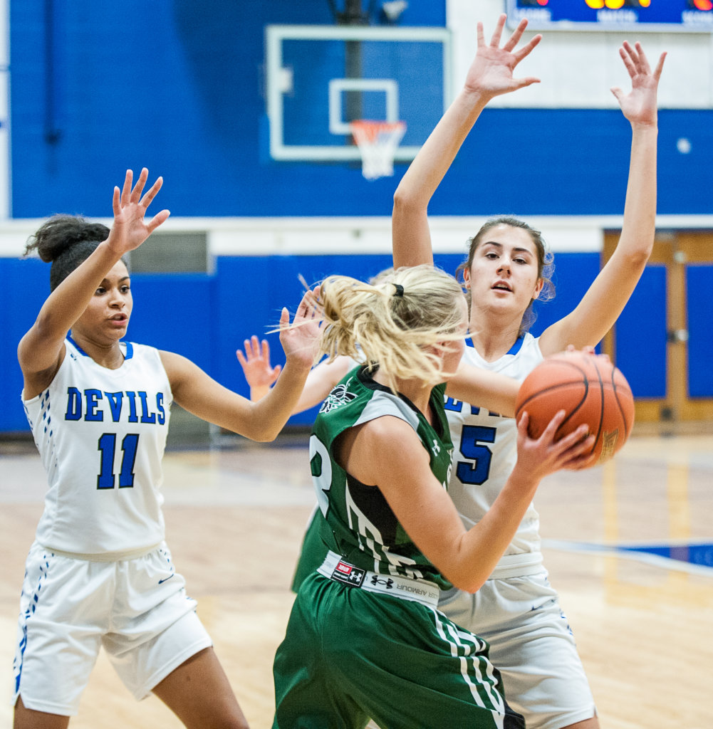 Lewiston’s Myah Nicolas, left and Lauren Foster, right, trap Leavitt’s Taylor White during one of 5 games in the 11th annual Auburn-Lewiston Sports Hall of Fame Gippers Basketball Tip-Off Classic at Lewiston High School that continues Saturday with 6 more games starting at 11:30 am. (Russ Dillingham/Sun Journal)