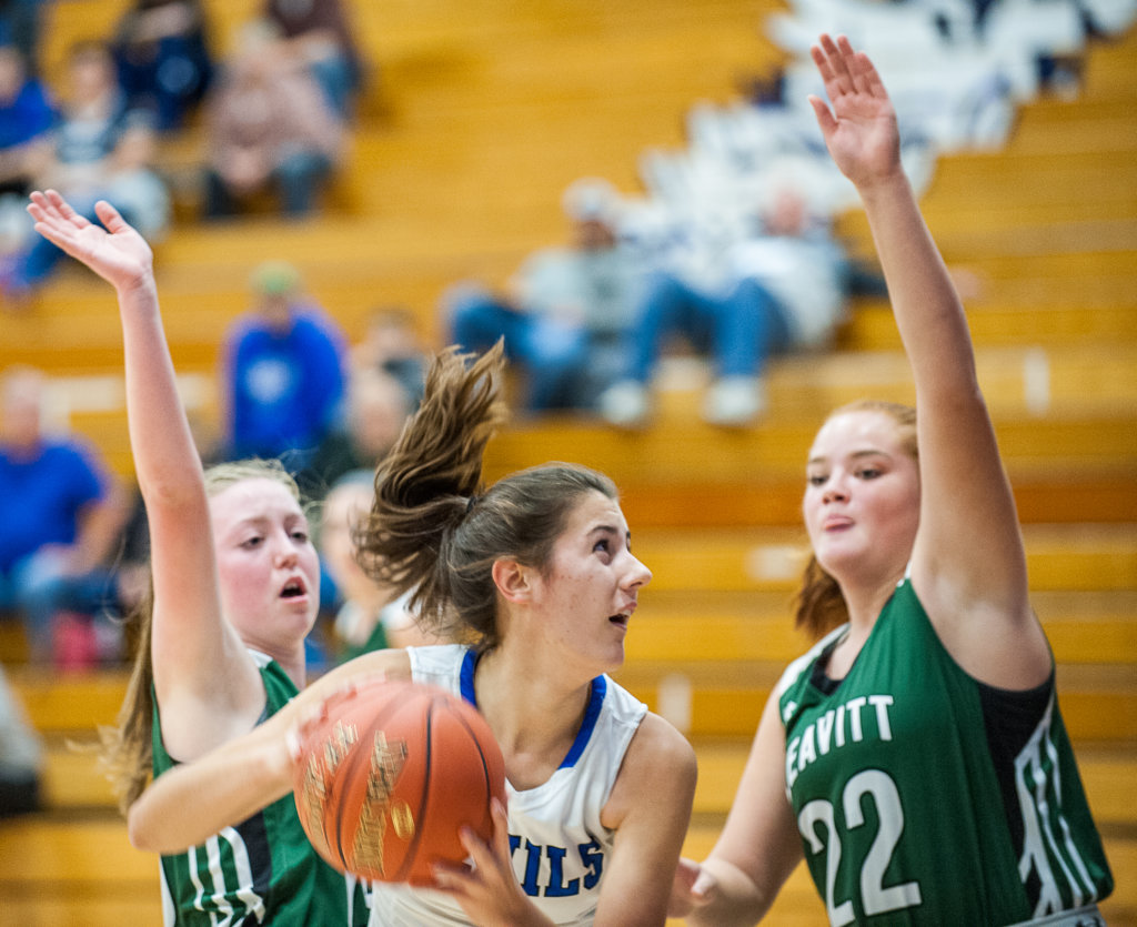 Lewiston’s Lauren Foster, center, drives to the basket while being defended by Leavitt’s Kayleigh Gilbert, left and Emelia Bowie, right during one of 5 games in the 11th annual Auburn-Lewiston Sports Hall of Fame Gippers Basketball Tip-Off Classic at Lewiston High School that continues Saturday with 6 more games starting at 11:30 am. (Russ Dillingham/Sun Journal)