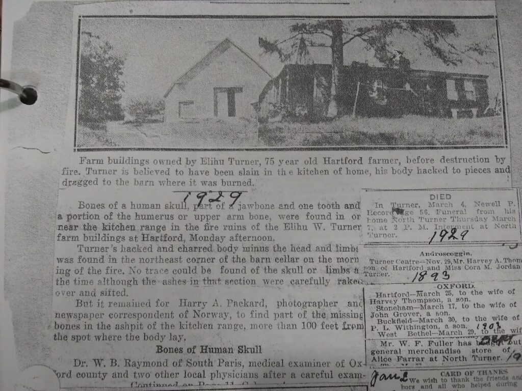 “Turner’s hacked and charred body minus the head and limbs was found in the northeast corner of the barn cellar the morning of the fire. No trace could be found of the skull or limbs at the time although the ashes in that section were carefully raked over and sifted,” the clipping continues.